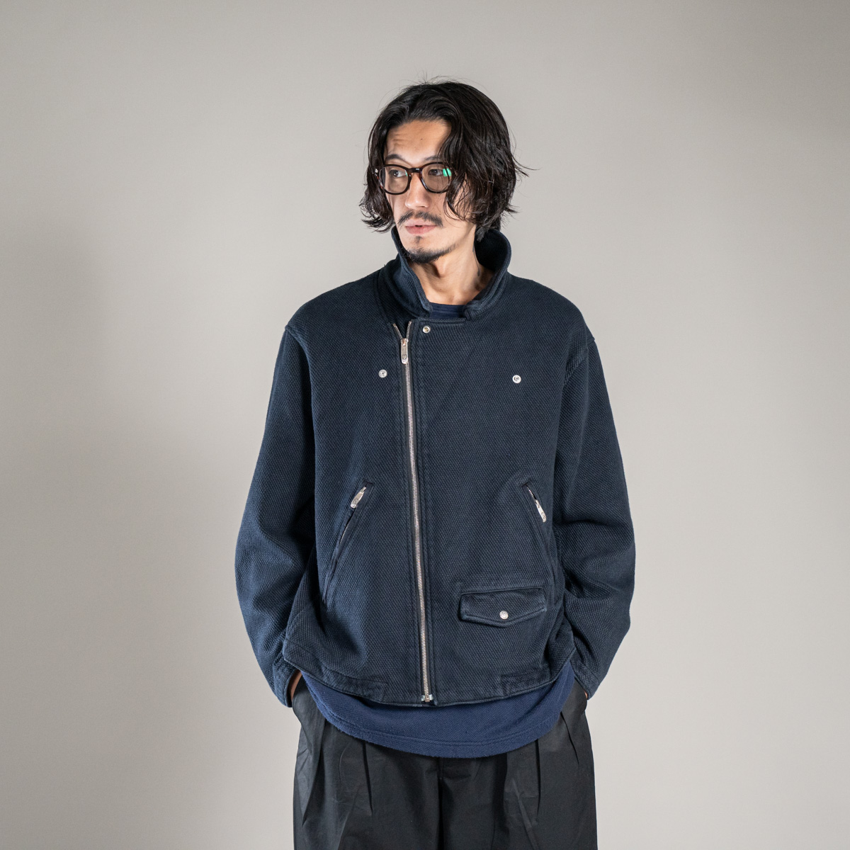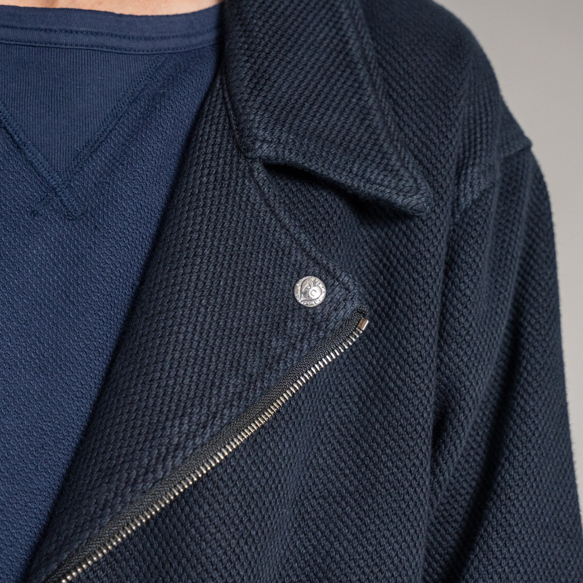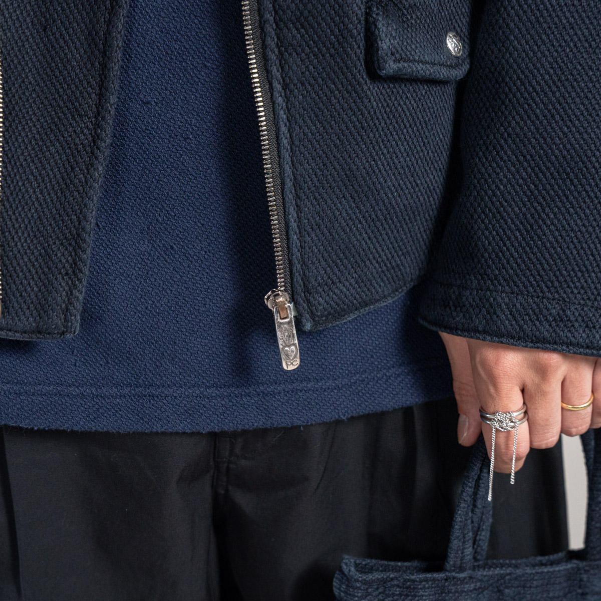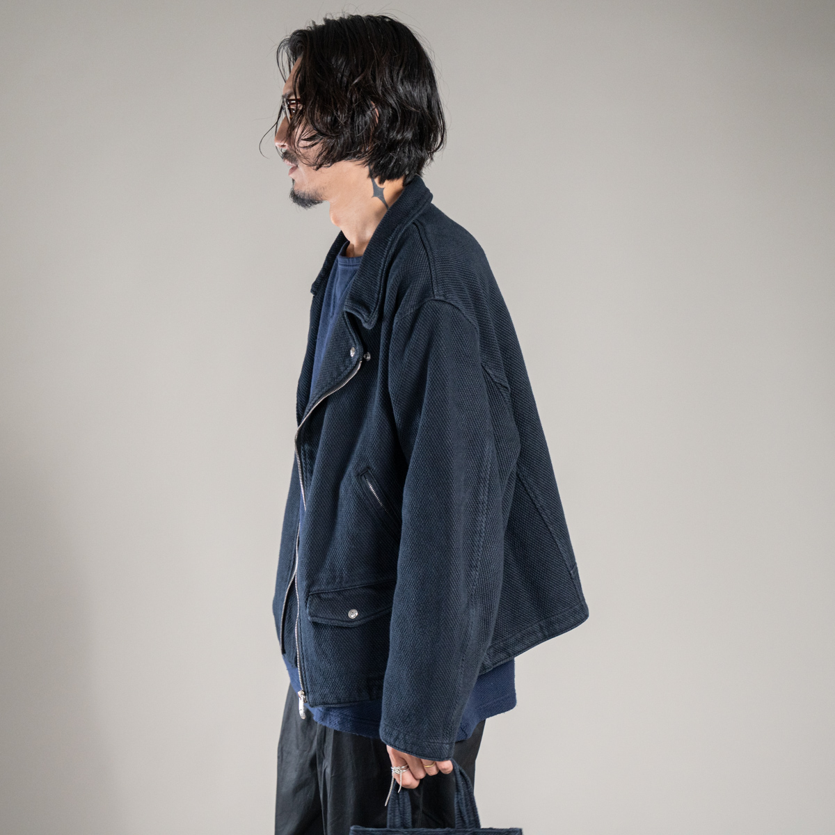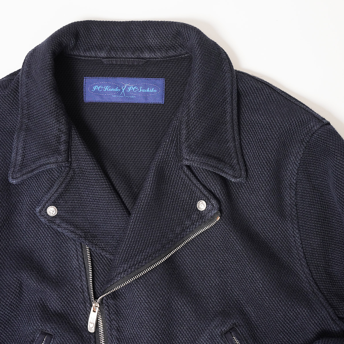ライダースジャケットの無骨な佇まいと、剣道着生地の柔らかさを融合させた一着。