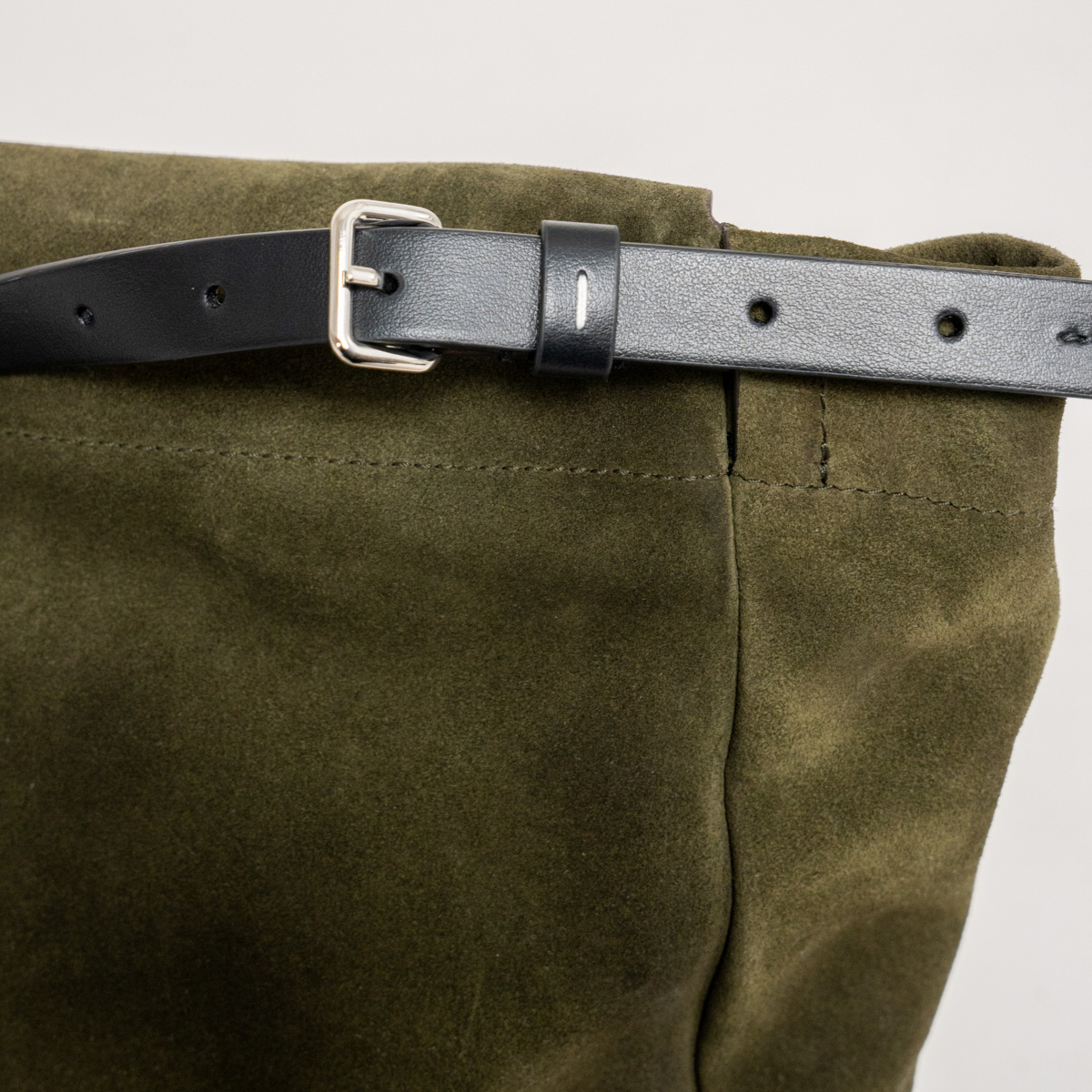 トーンを抑えたカーキスエードの中で、このディテールが控えめなアクセントになっています。