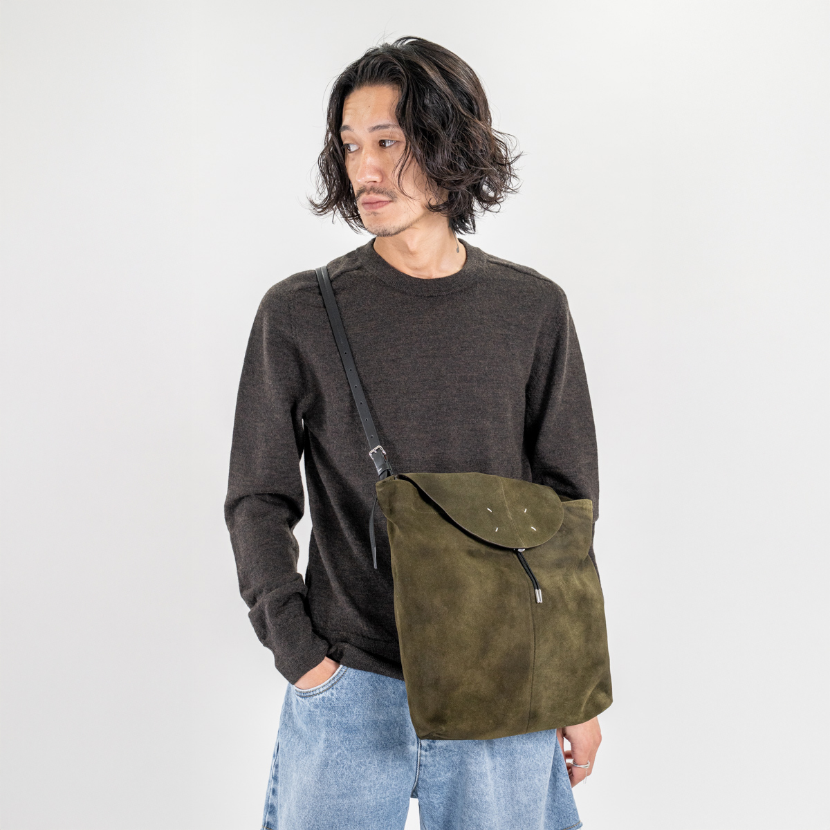 ハリのあるレザーとは違い、荷物の量やストラップの長さによって自然に形を変えながら、からだの側面に沿って落ちてくれます。