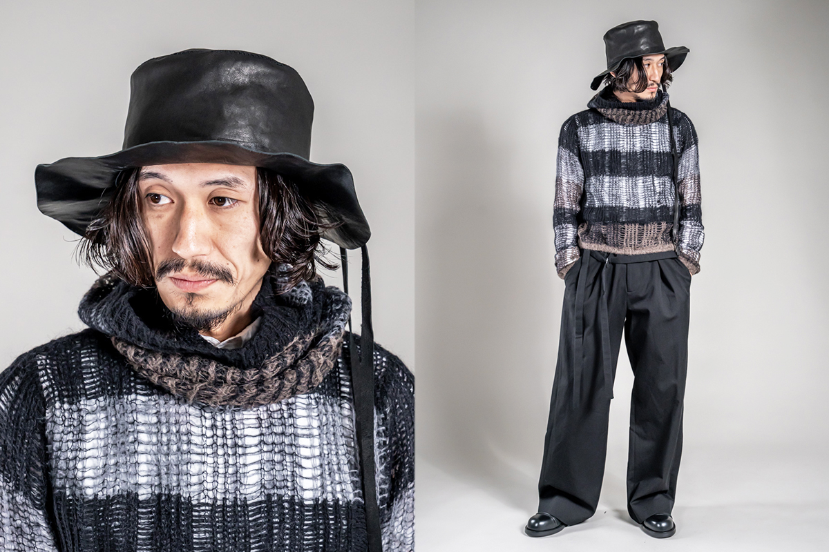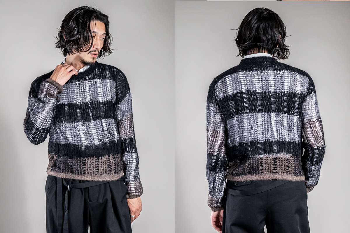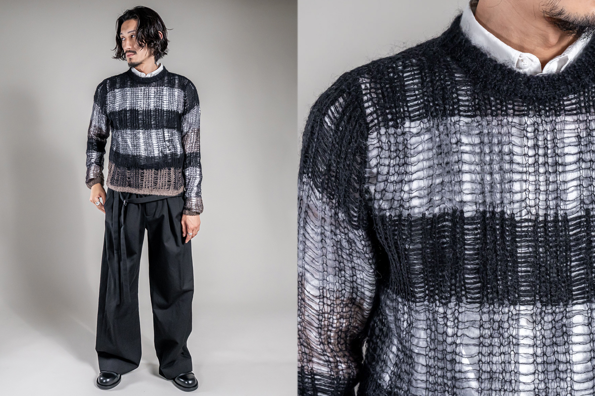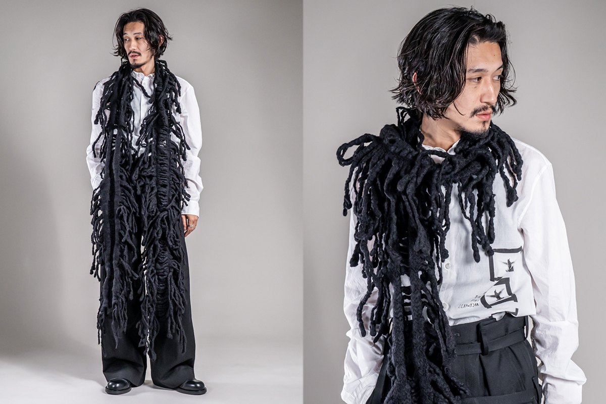 コレクションのルックでも使用されていた透け感のあるニットや、印象的なフリンジストール、襟をストールに見立てたアイテムなど7型のアイテムが入荷しております。