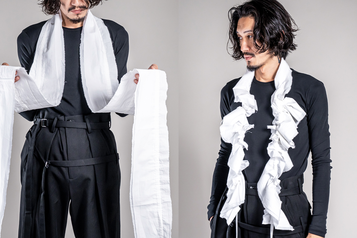 襟をイメージした薄手のホワイトファブリックにたっぷりとギャザーを寄せることができるロングストール。