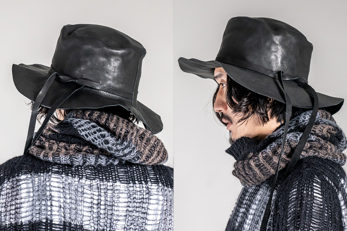 クラシカルな形をベースにしながらも、やや波打つようなブリムのシルエットが独特で、スタイリング全体にANNらしさを感じさせてくれます。