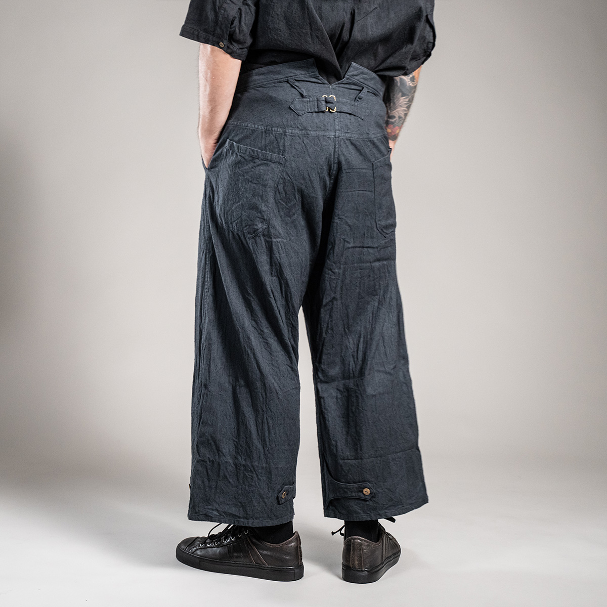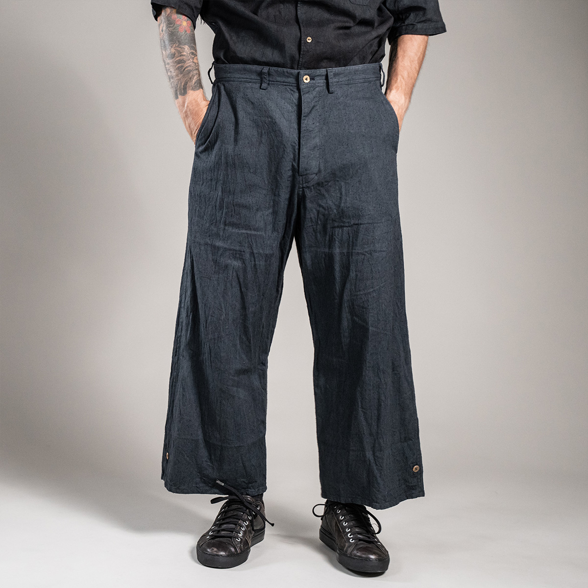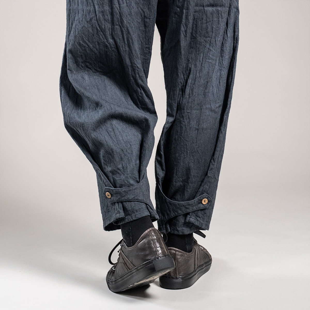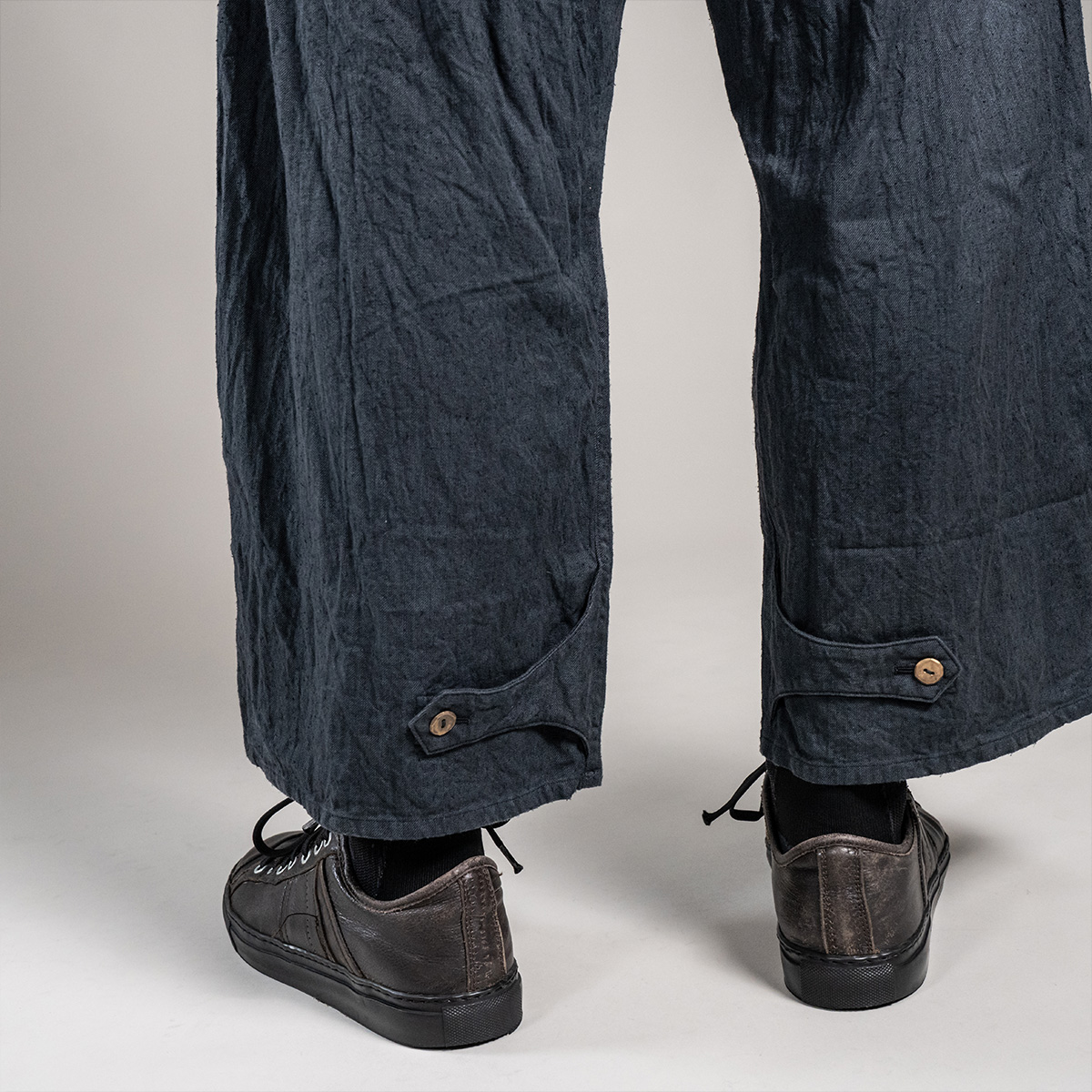 裾を絞ればすっきりとしたテーパードラインに、ボタンを外せばストンと落ちるリラックスしたワイドストレートに。