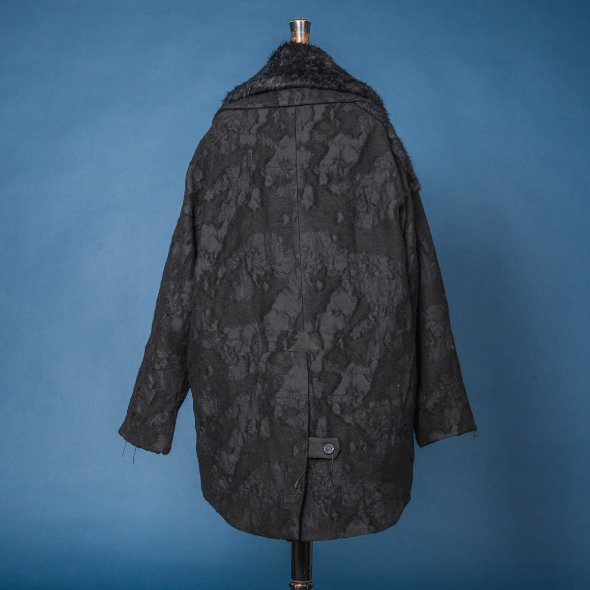 量感を抑えた配分で顔まわりに上質な陰影をつくり、コート全体の重心を自然に下げてくれます。