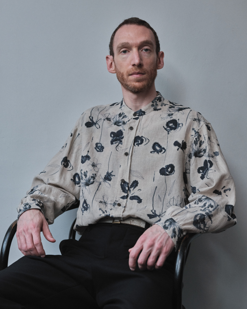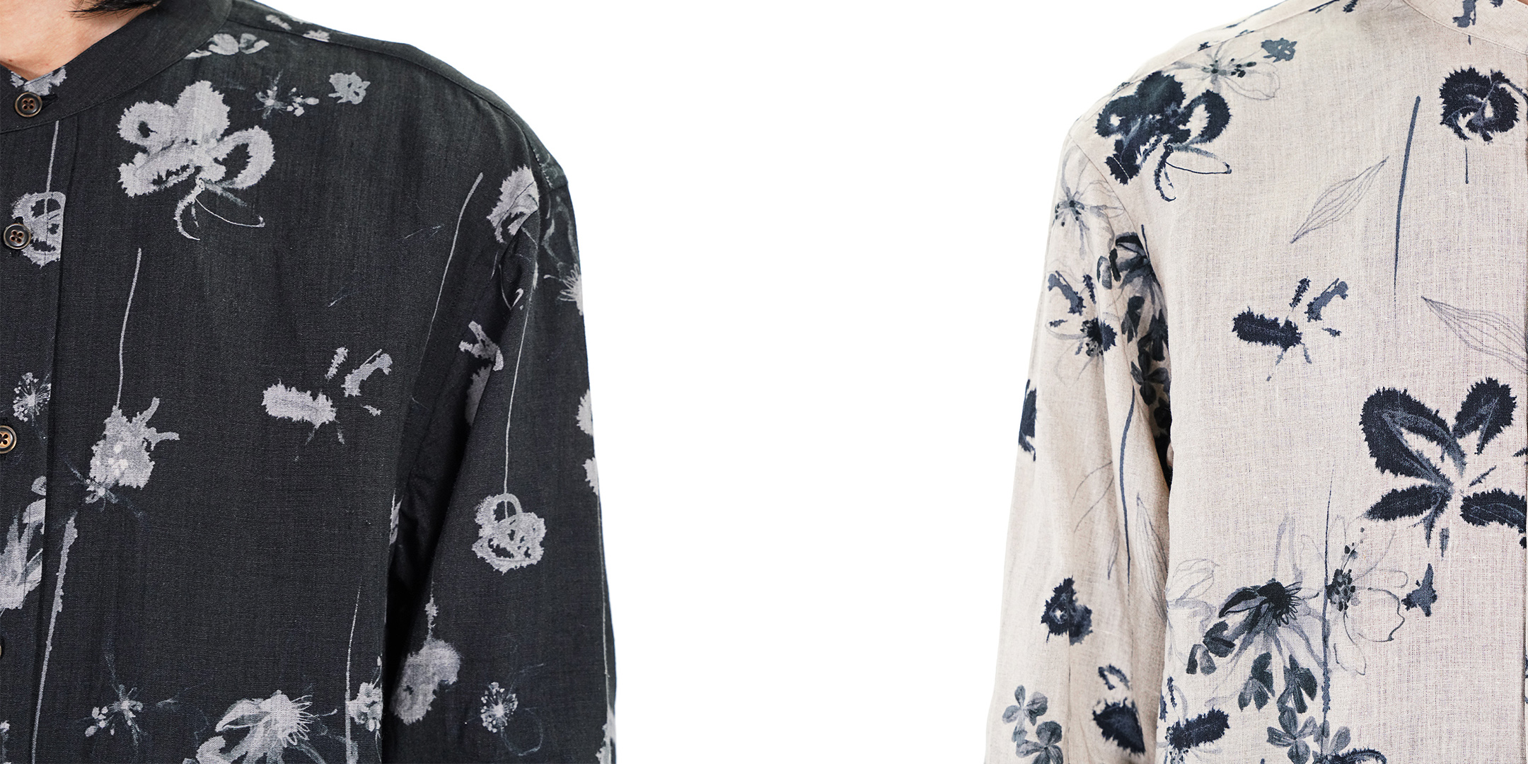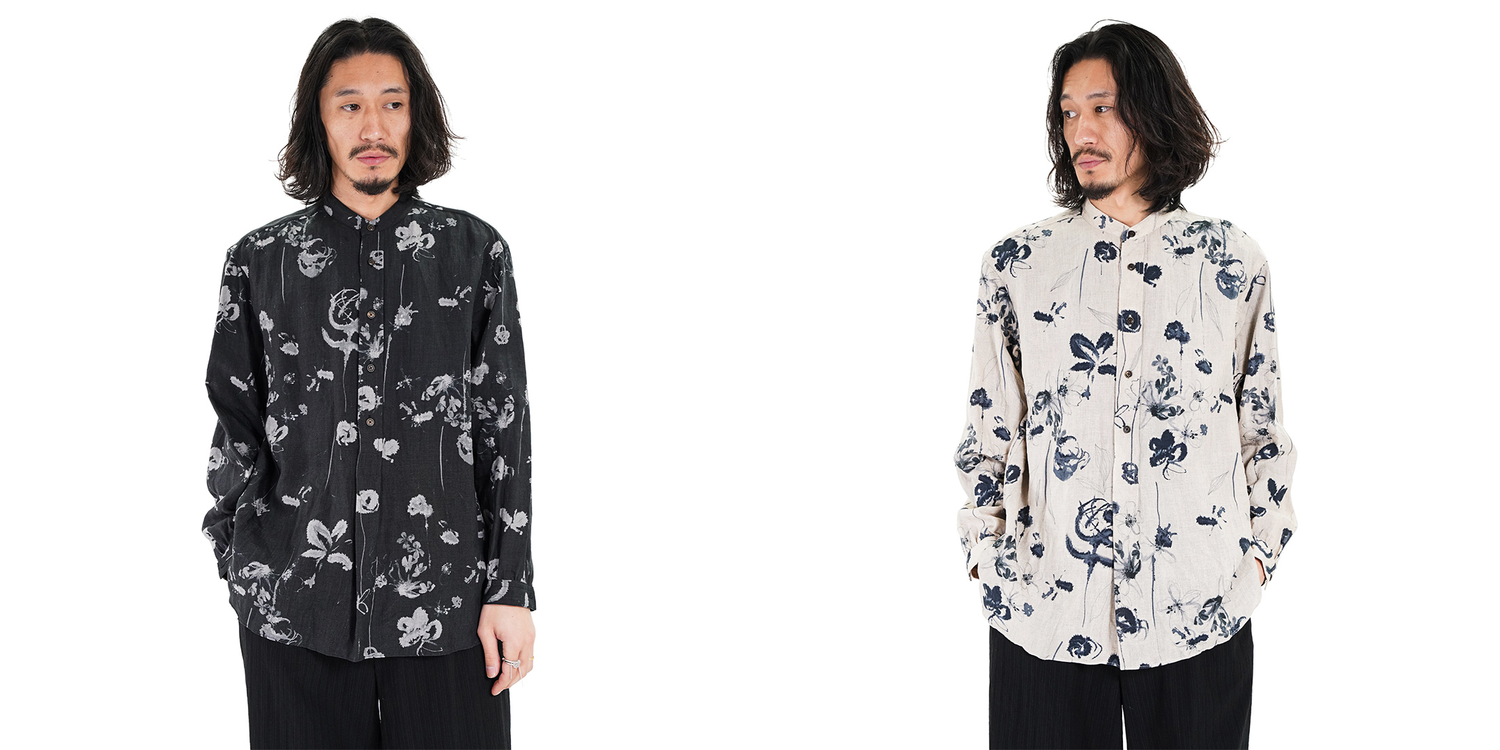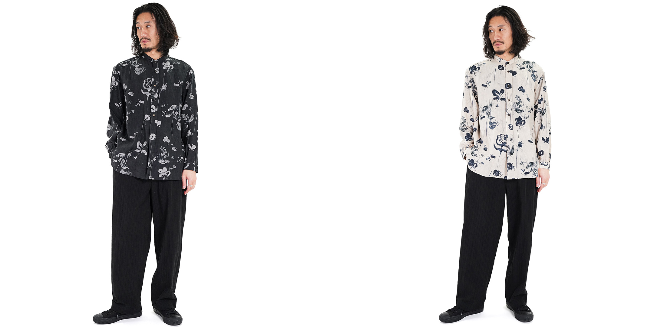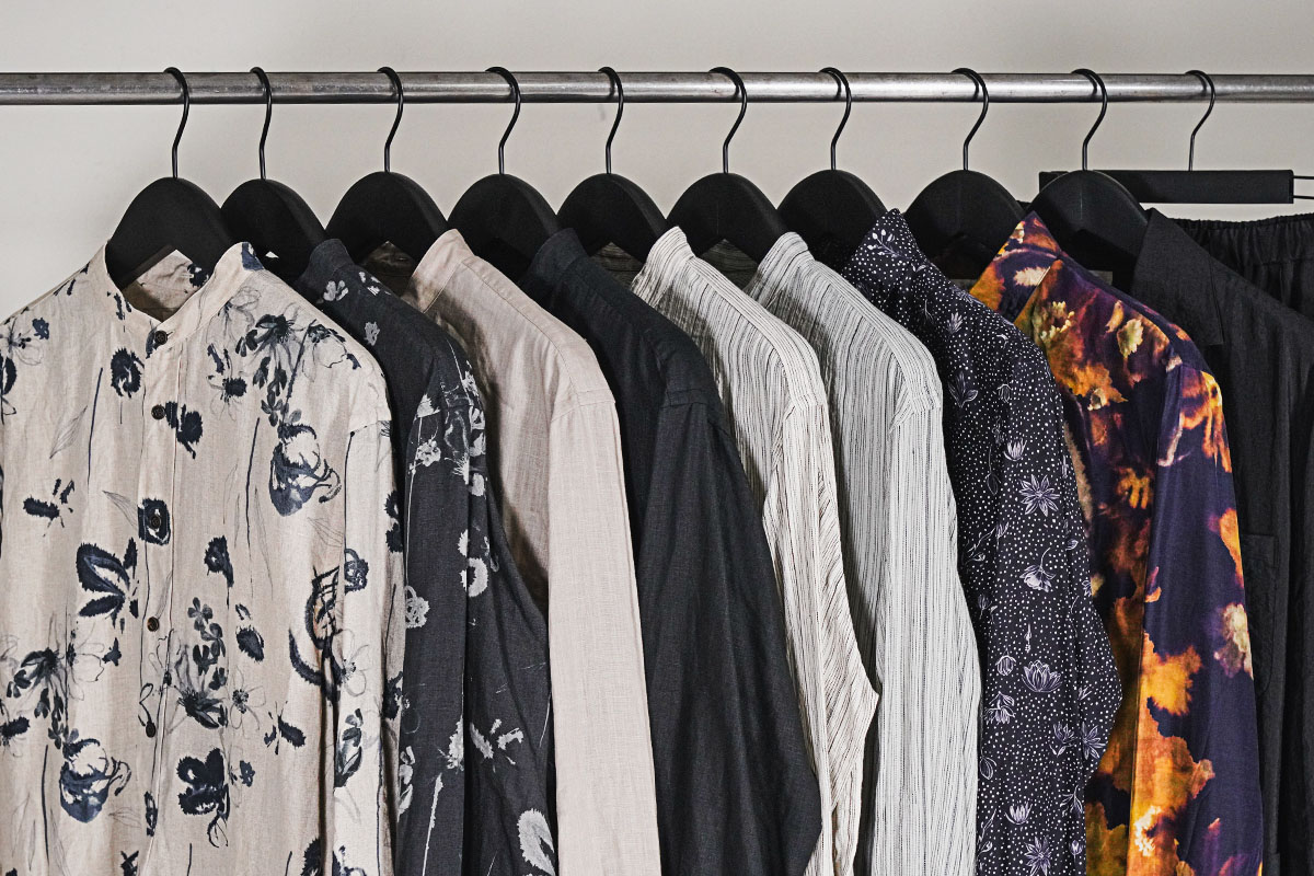 ベーシックなレギュラーカラーに落とし込むことで、柄の存在感を引き立てながらも日常に溶け込むバランスに仕上げています。