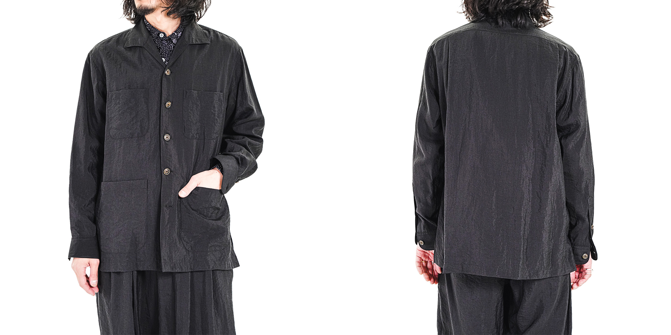 クラシックなオープンカラーシャツジャケットは、軽やかで清涼感のある佇まい。