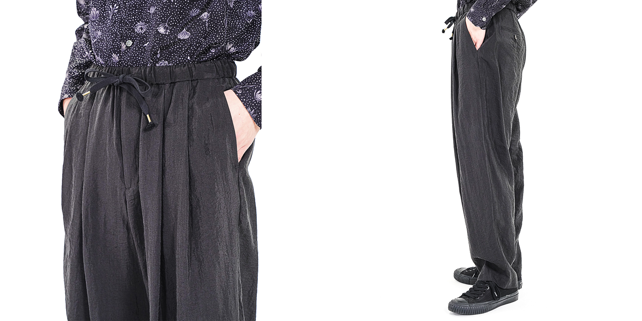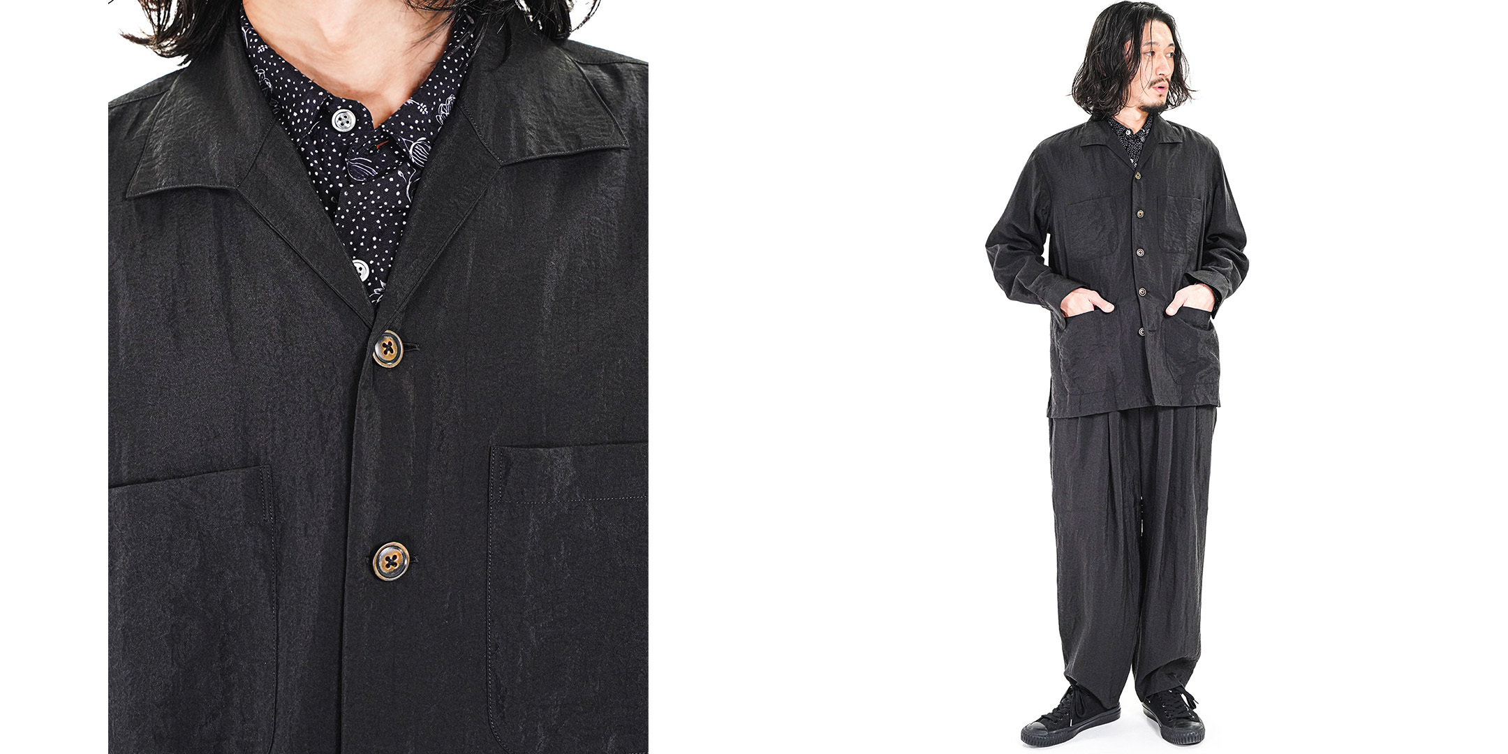 シルクならではの上質な光沢と落ち感。 そこにキュプラの程よいハリを重ねることで、柔らかさの中に芯を感じる素材へと昇華しています。