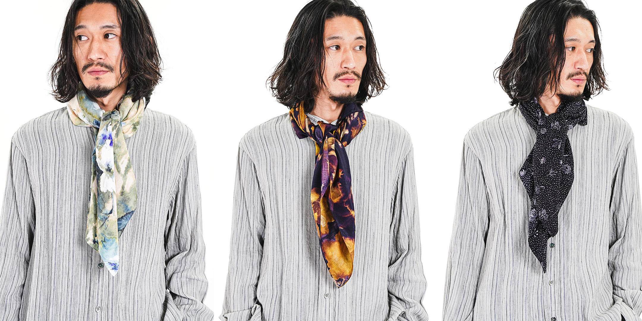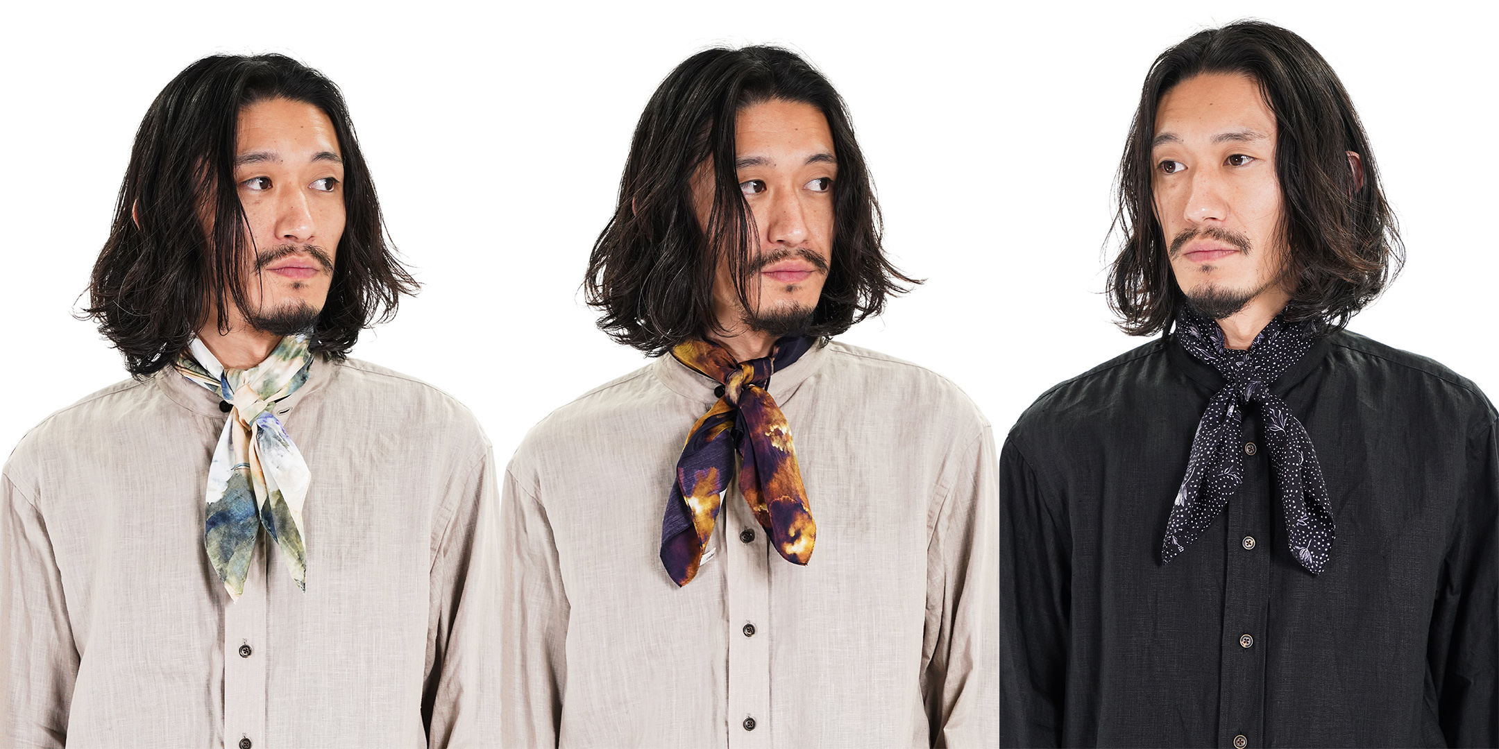 首元に巻くことで、シャツとはまた異なるニュアンスが生まれます。