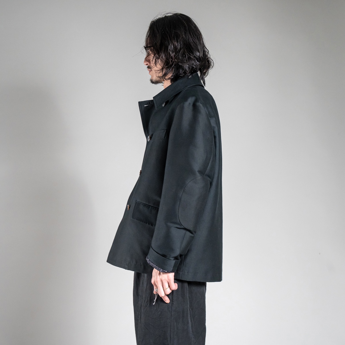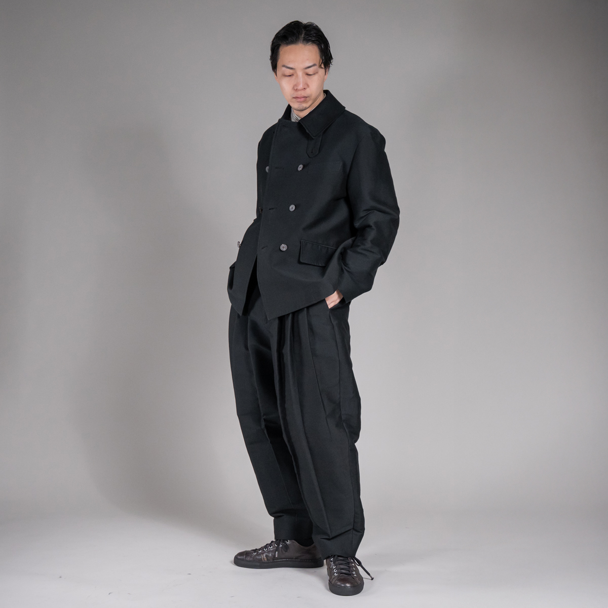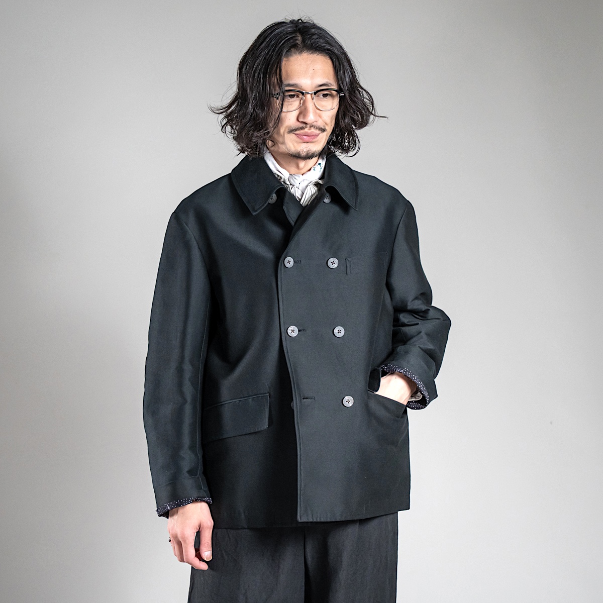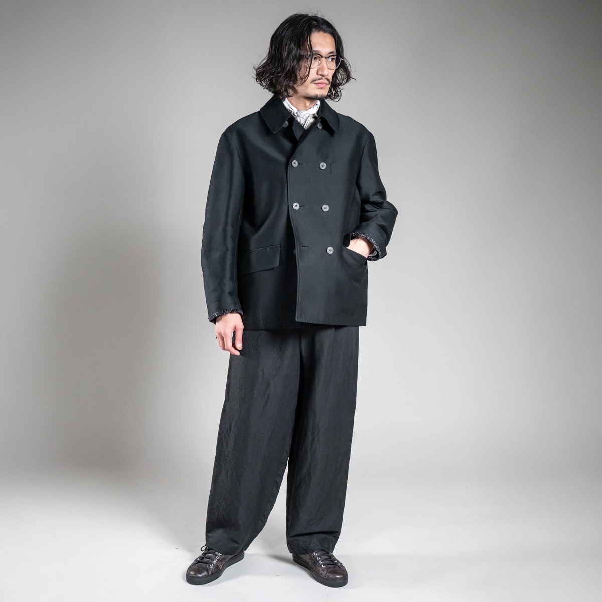 最初に目を引くのは、ダブルのピーコートを思わせるワーカーズジャケット。