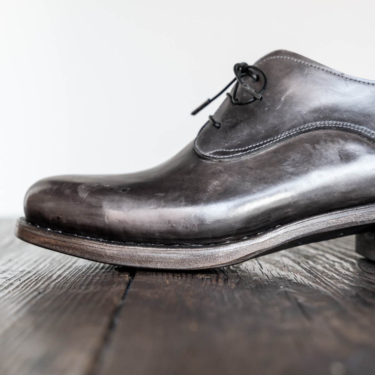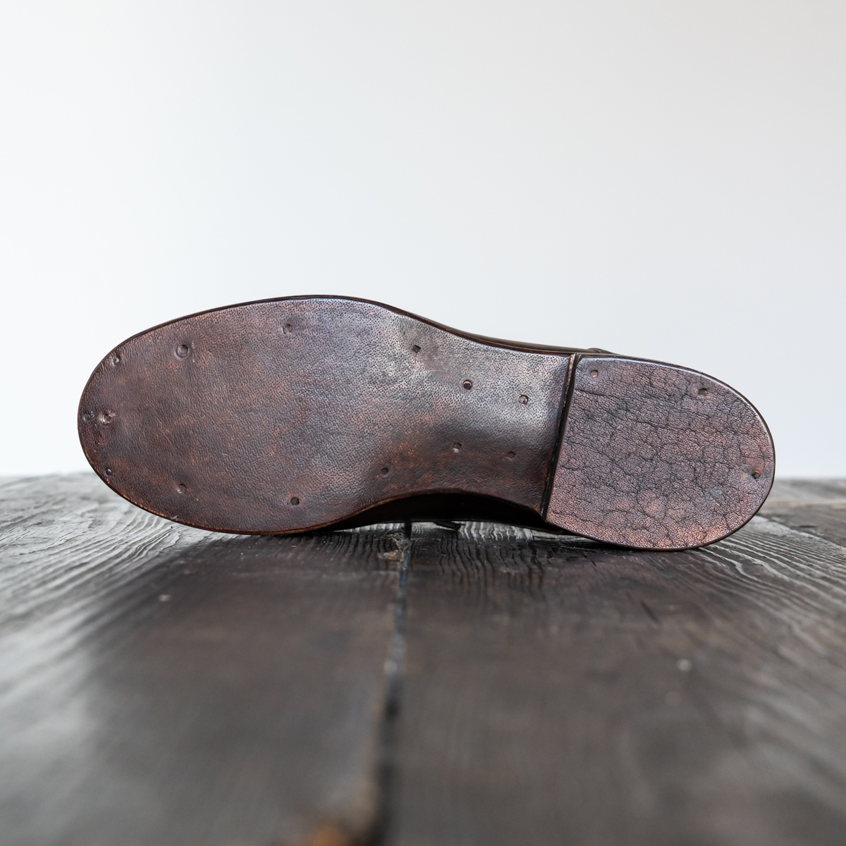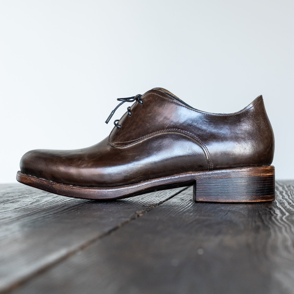 外羽根式のシンプルな構造に見えながら、実は二枚革で仕立てられており、特にかかとの曲線が独特の表情を生み出しています。