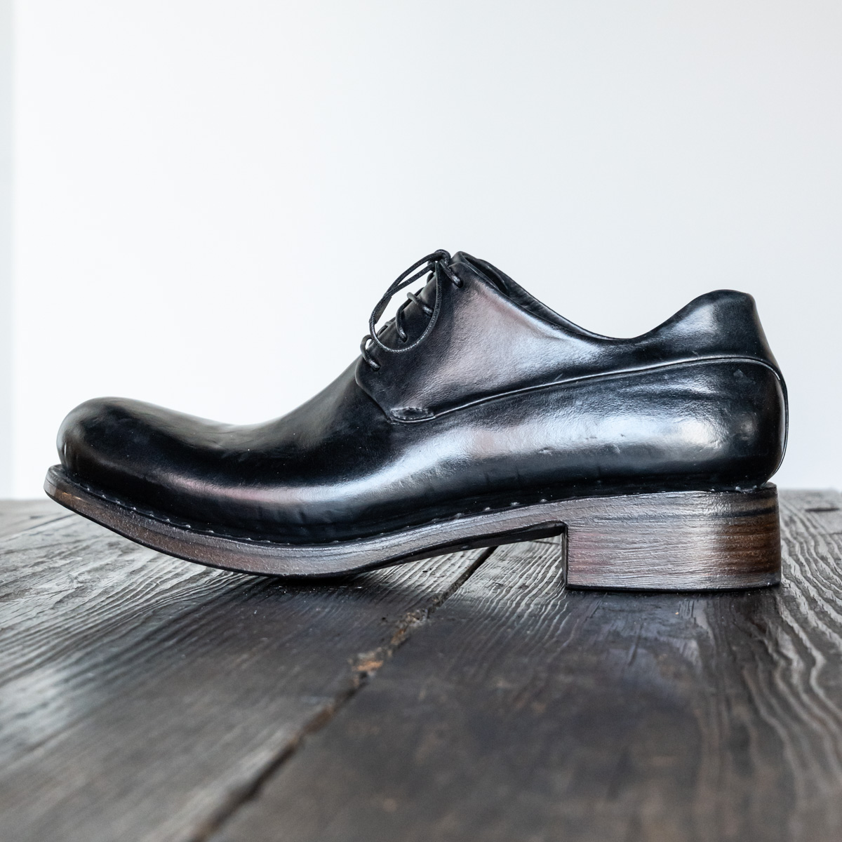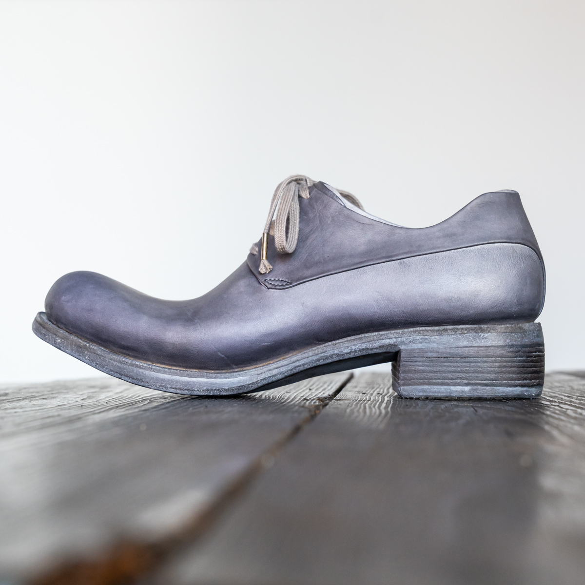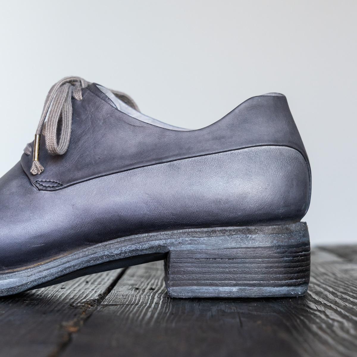 外羽根式のシンプルな構造に見えながら、実は二枚革で仕立てられており、特にかかとの曲線が独特の表情を生み出しています。
