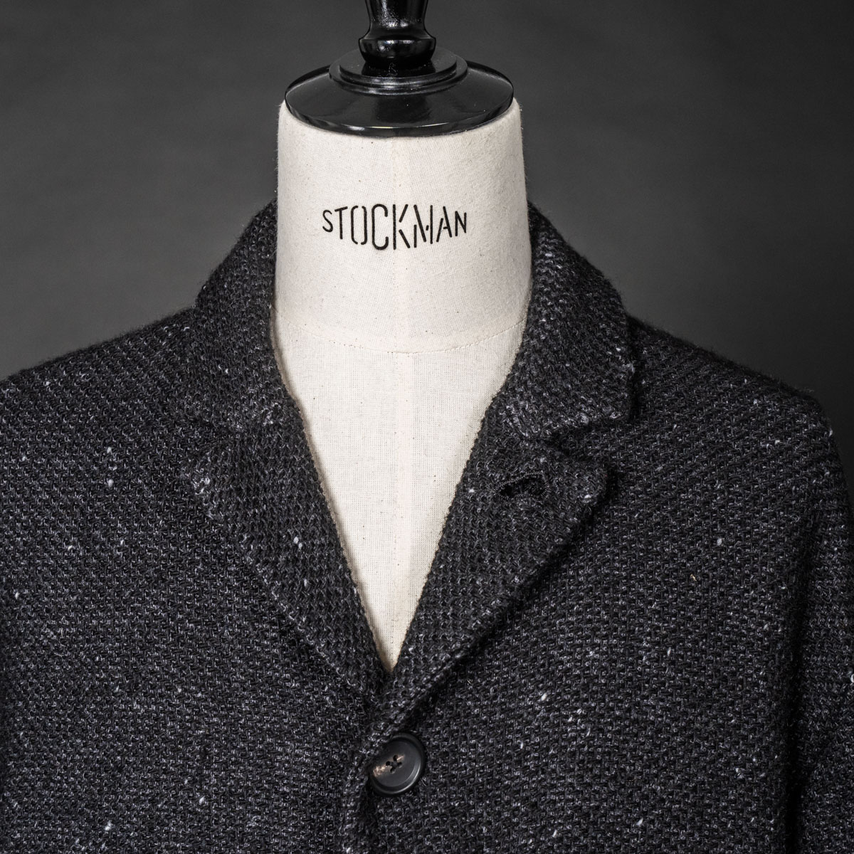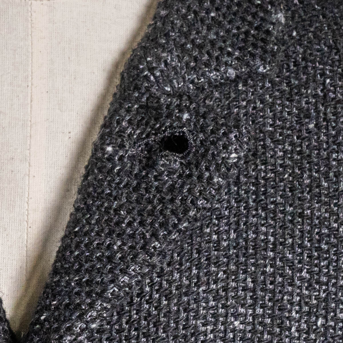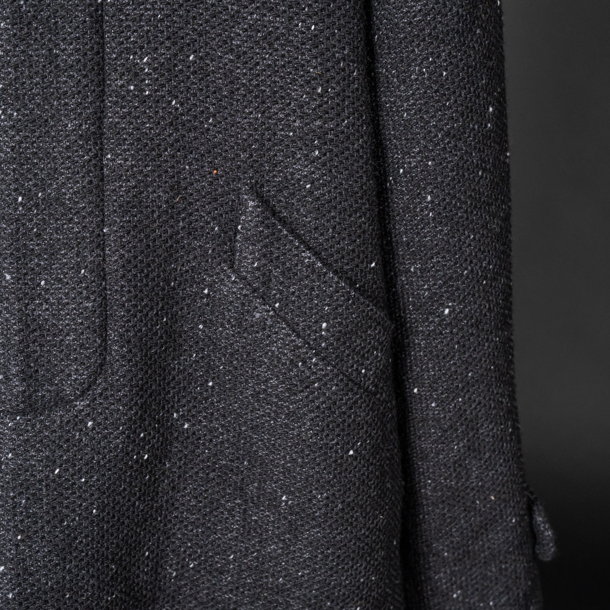 袖は中心で割った独自の縫い割りで、前身頃には斜めのウェルトポケット。