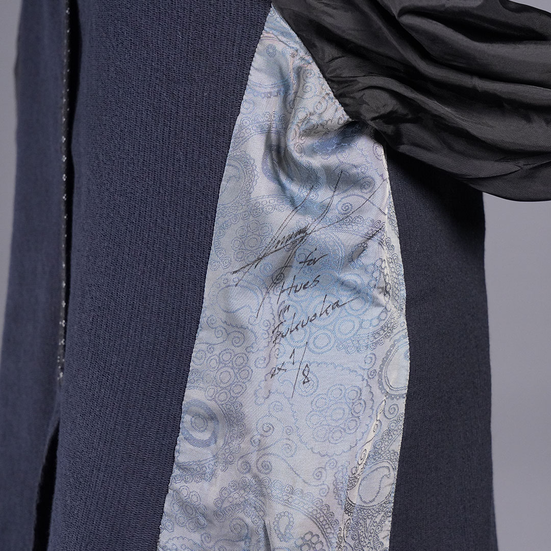 この2種類の裏地を使い分けることで、着用時の快適さだけでなく、美しいドレープも生まれています。