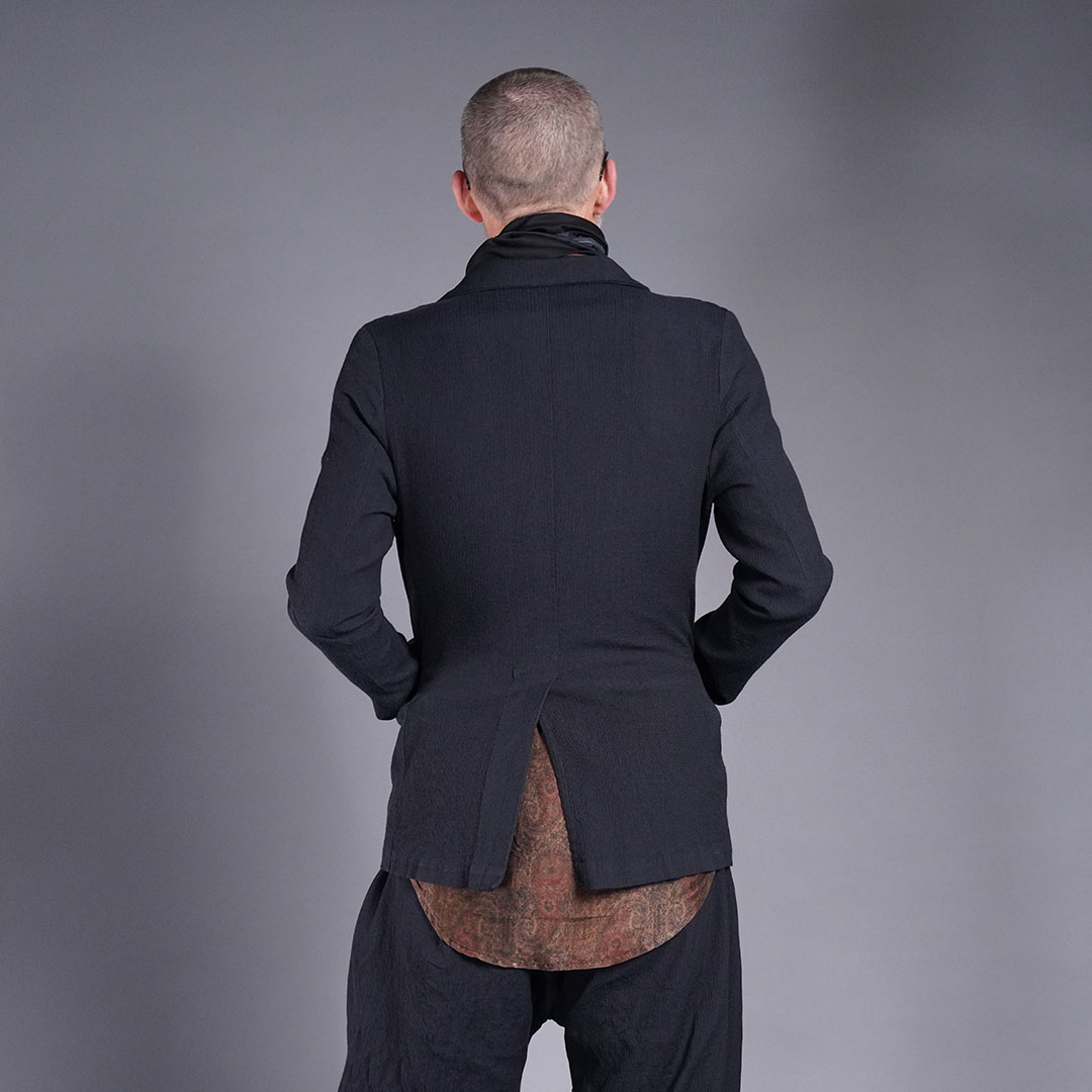 背面はセンターベント仕様で、腰回りの可動域を確保しながらも、背中に自然なドレープが生まれる設計です。