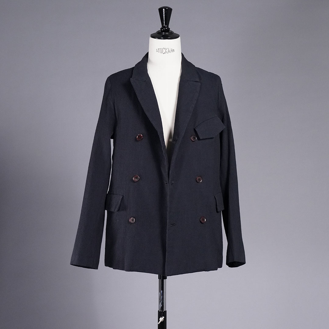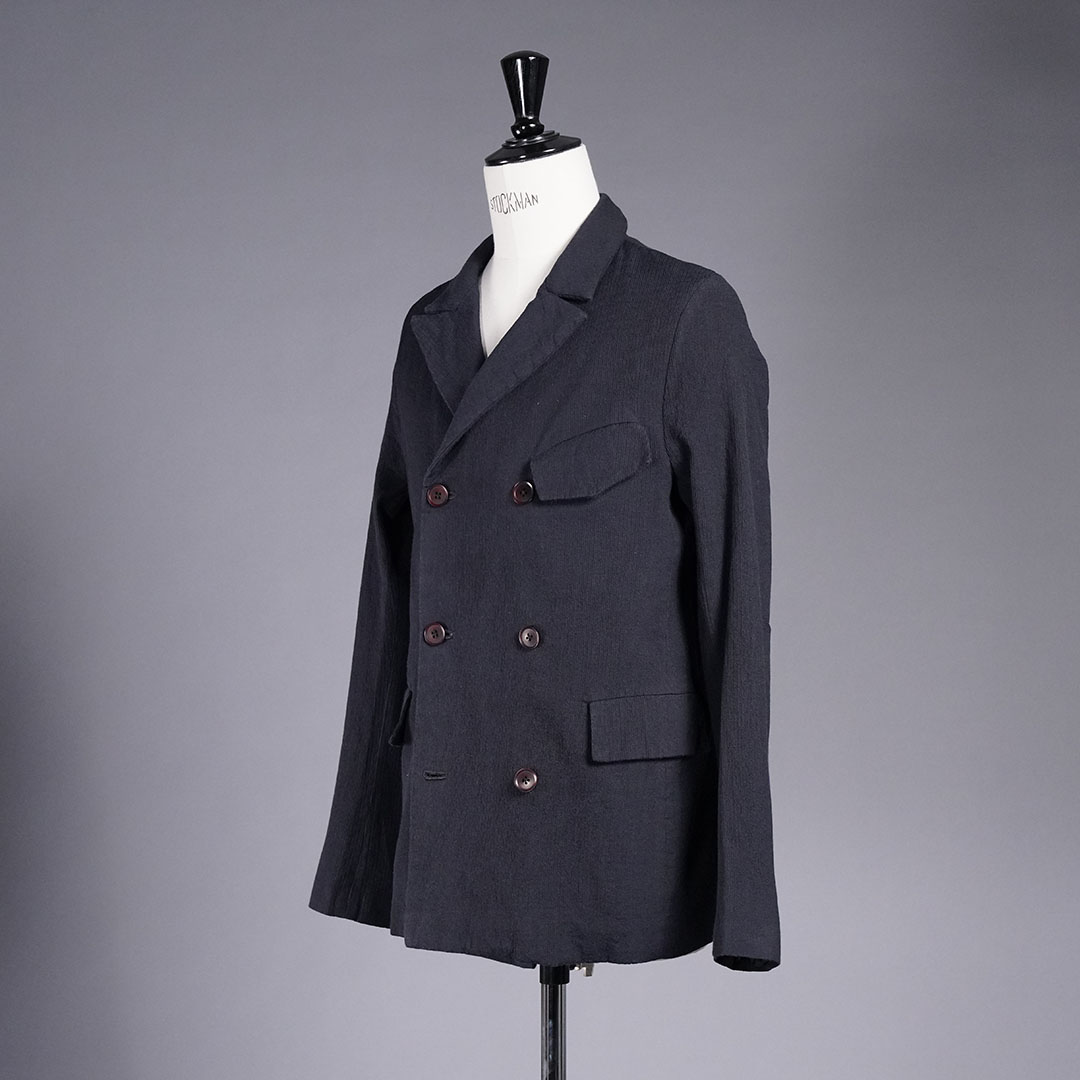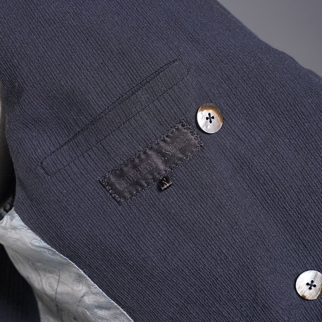 ウエストには緩やかな絞りが入り、クラシックなダブルブレストジャケットらしい立体感を生み出しています。