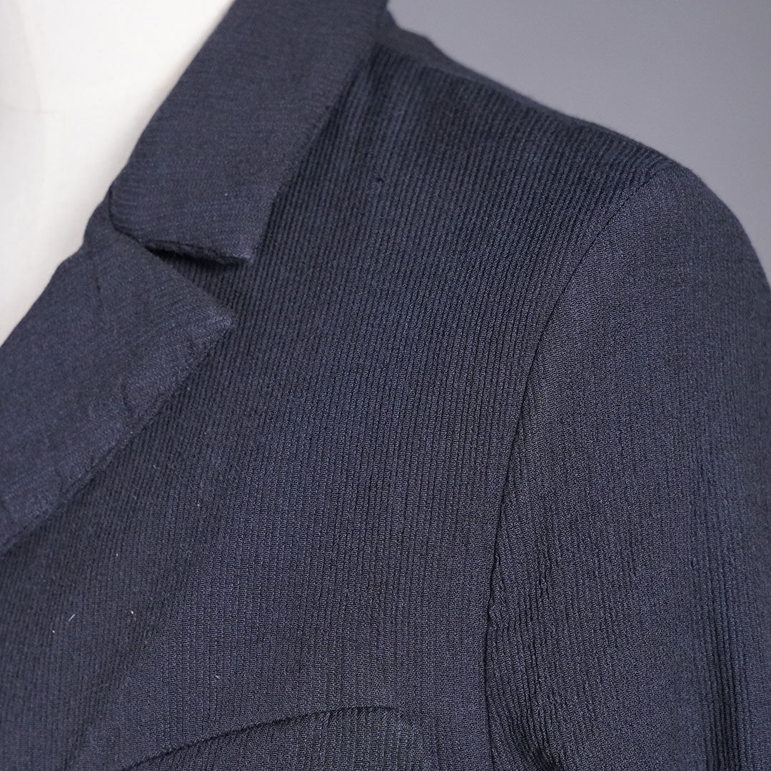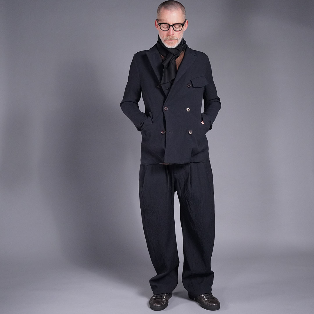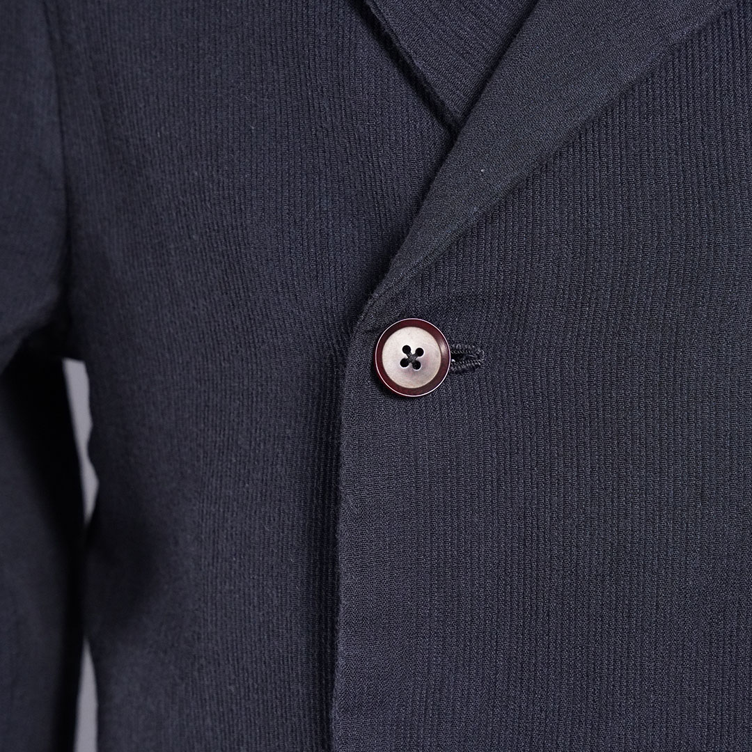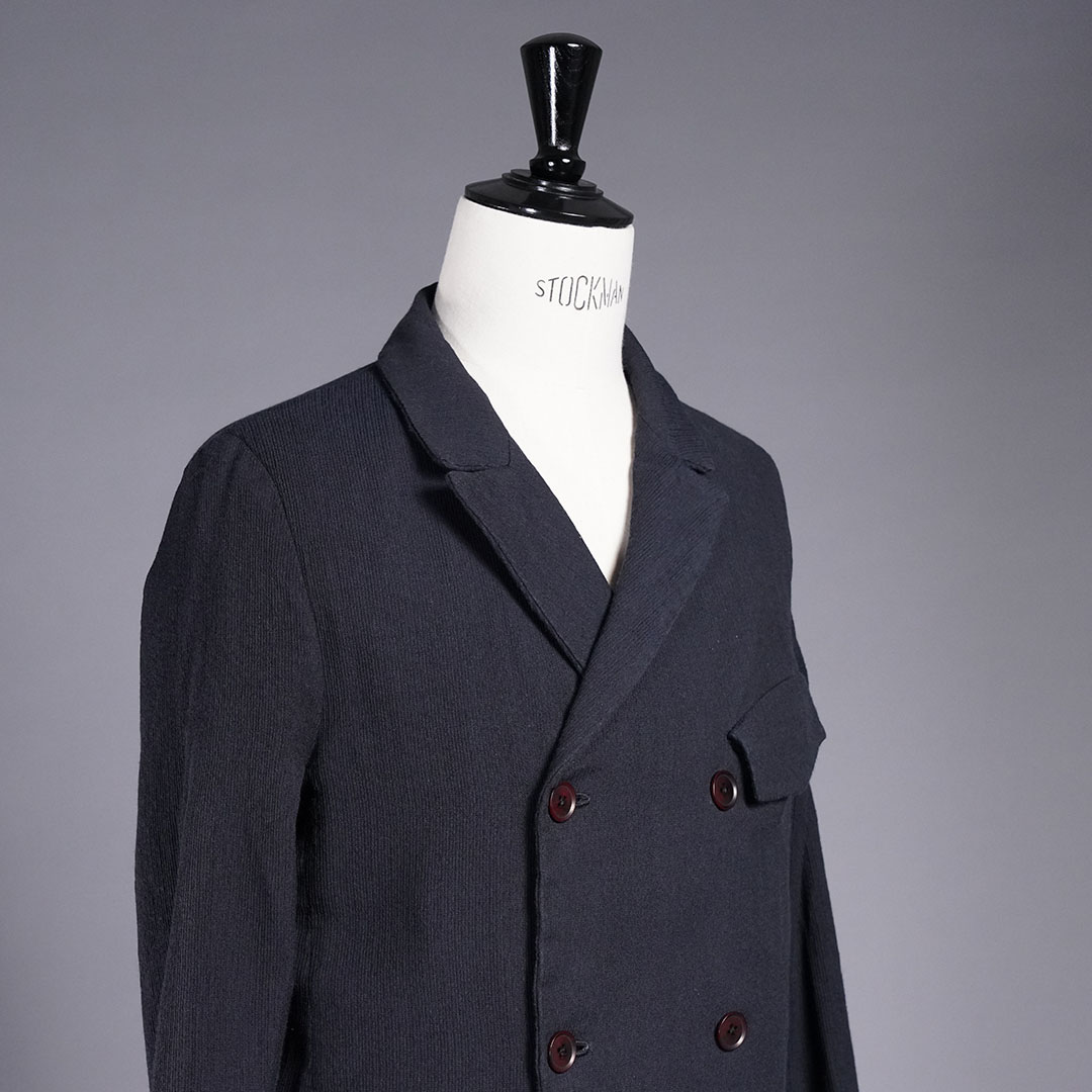 ウエストには緩やかな絞りが入り、クラシックなダブルブレストジャケットらしい立体感を生み出しています。