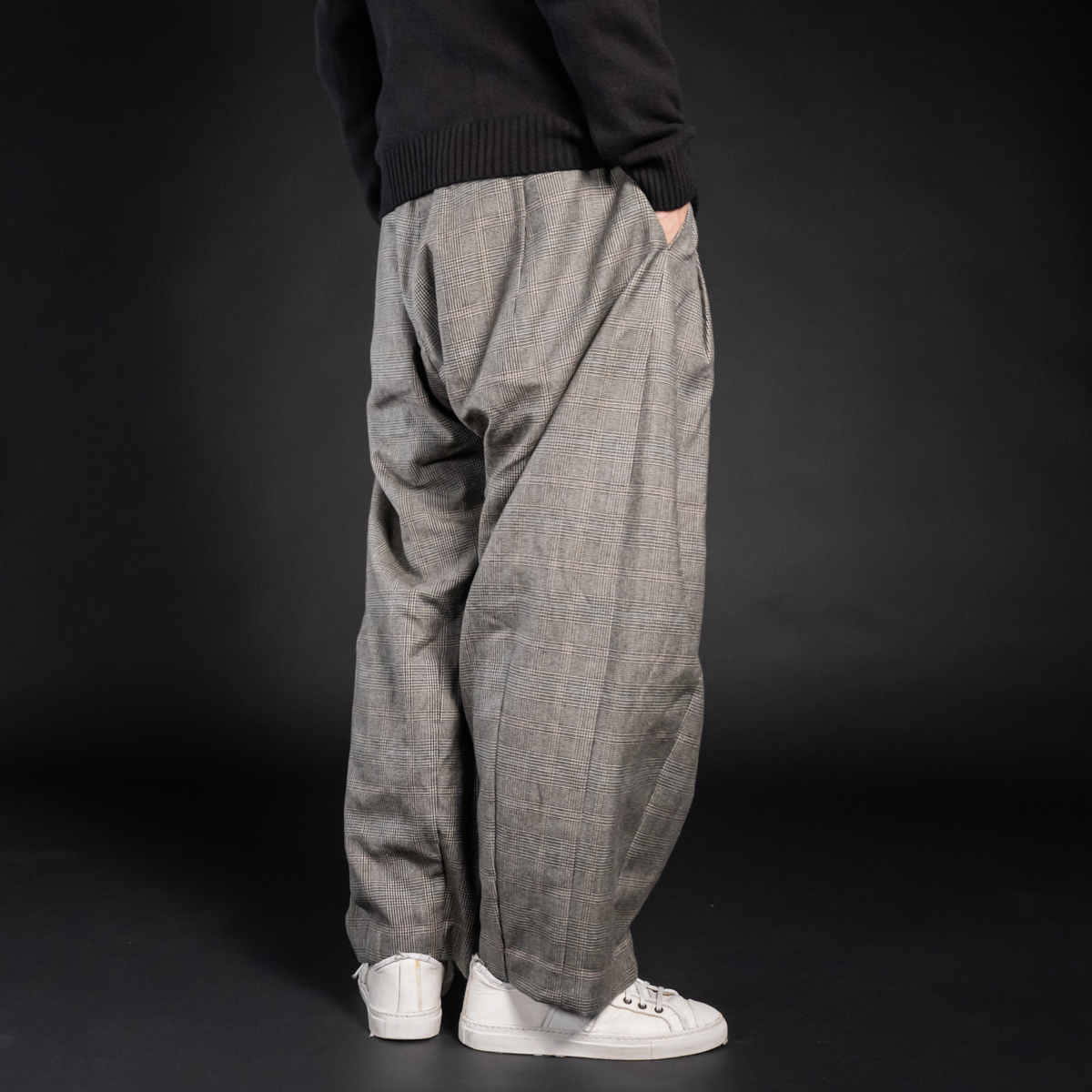 とくに、チェック柄の生地をたっぷりと使うことで、パンツの動きに合わせて生まれるドレープ感が非常に上品。