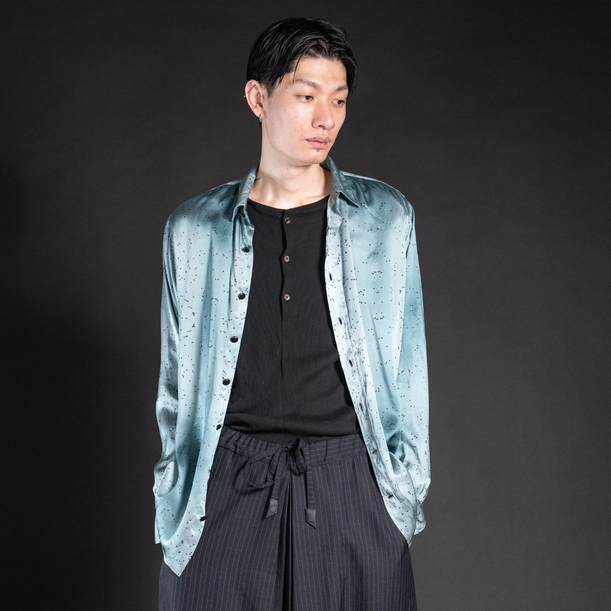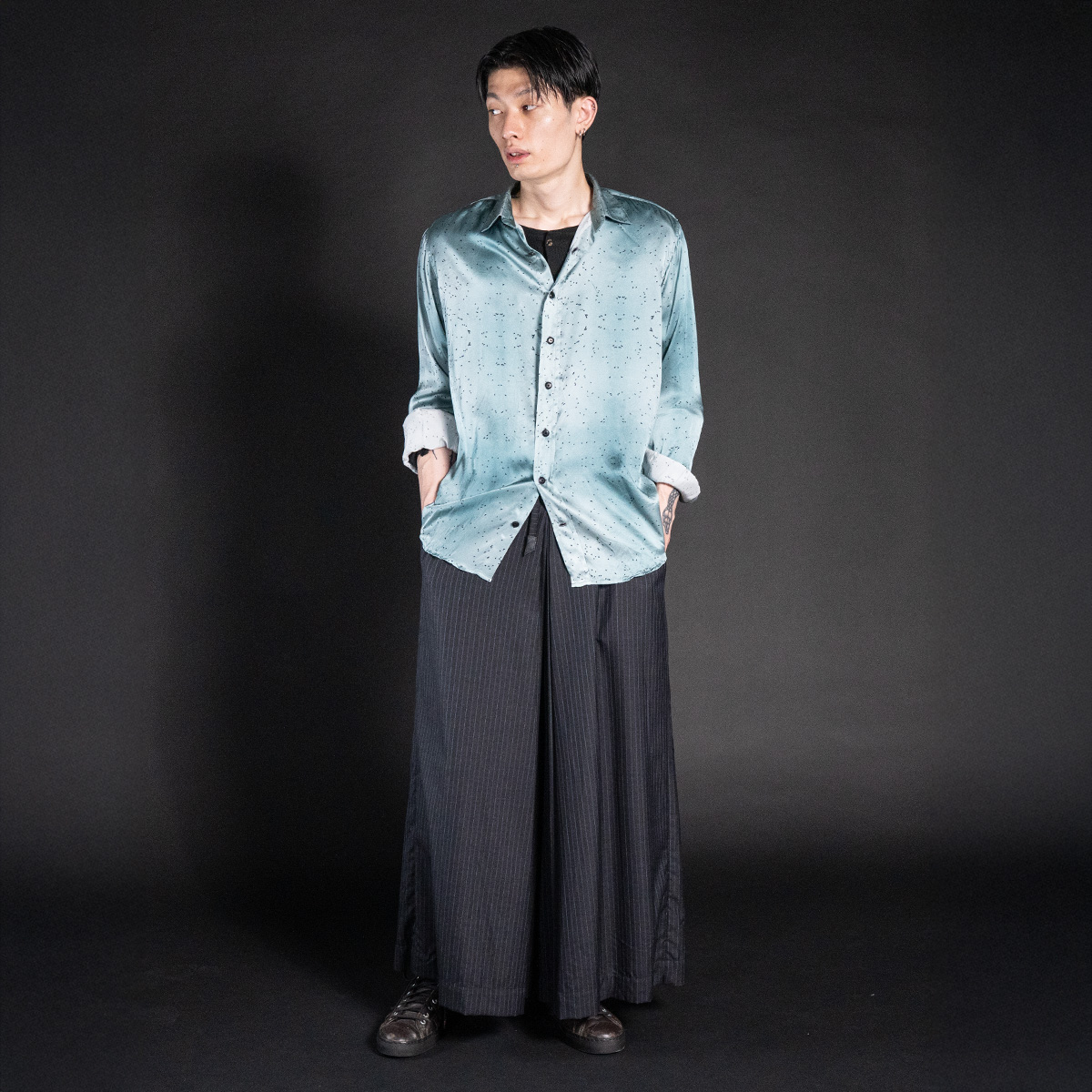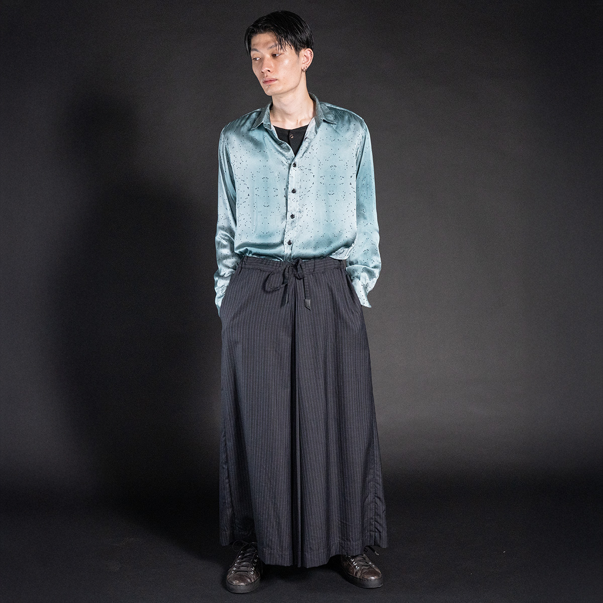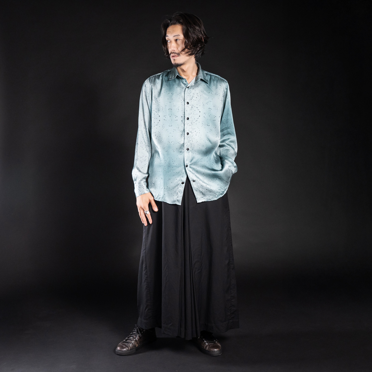 ラッソサテン特有の滑らかさと落ち感が、身体の動きに呼応して静かに揺れ、光と陰を美しく反射する。