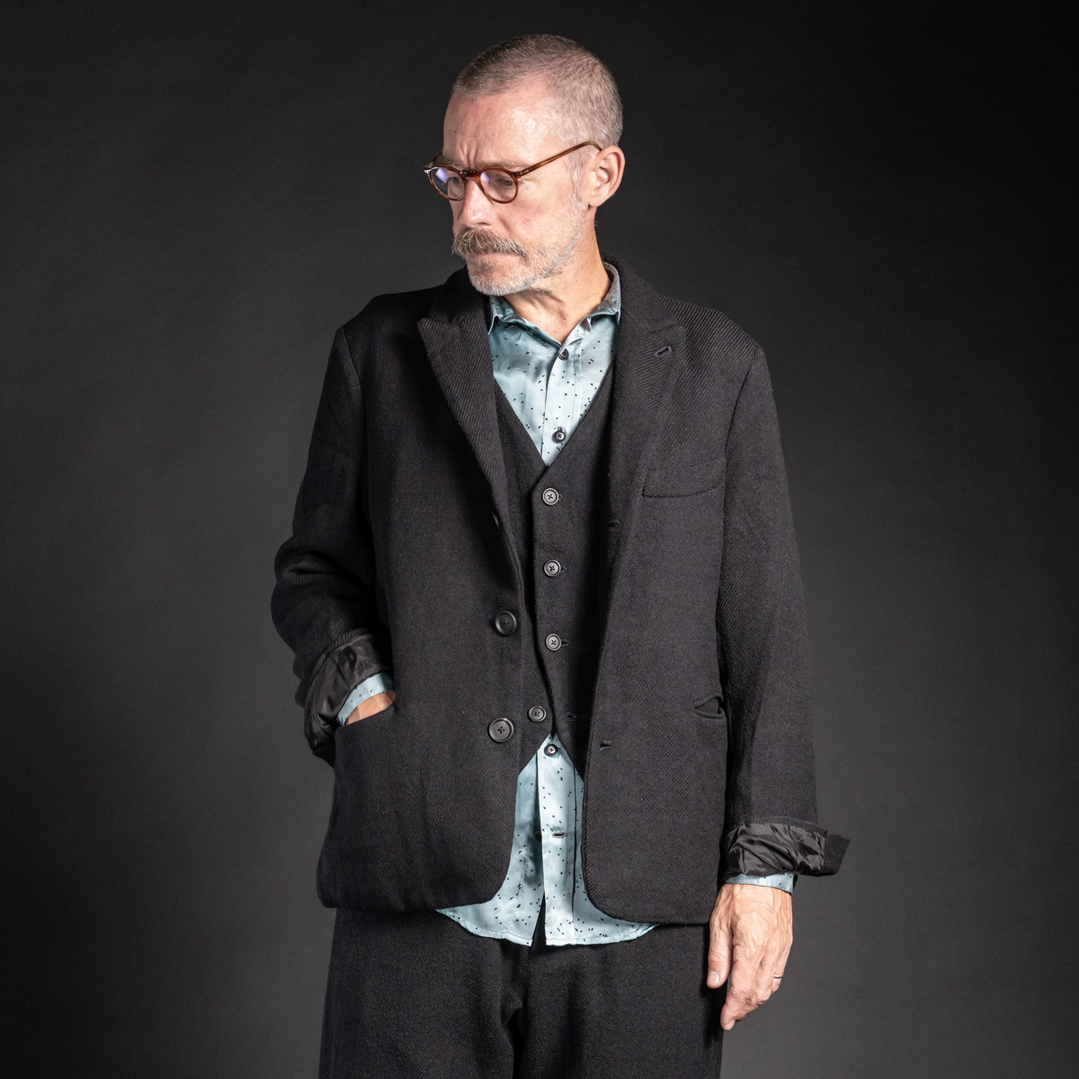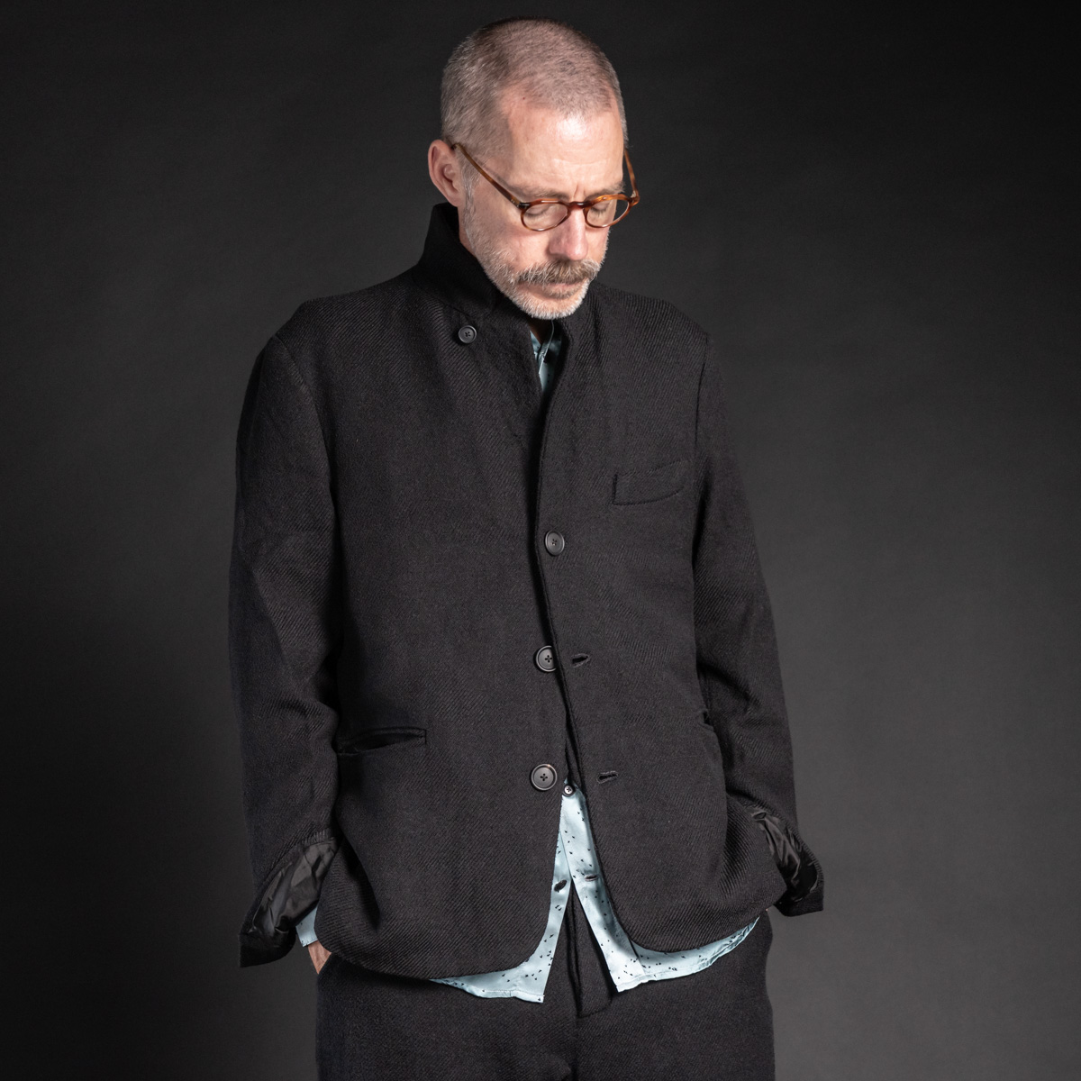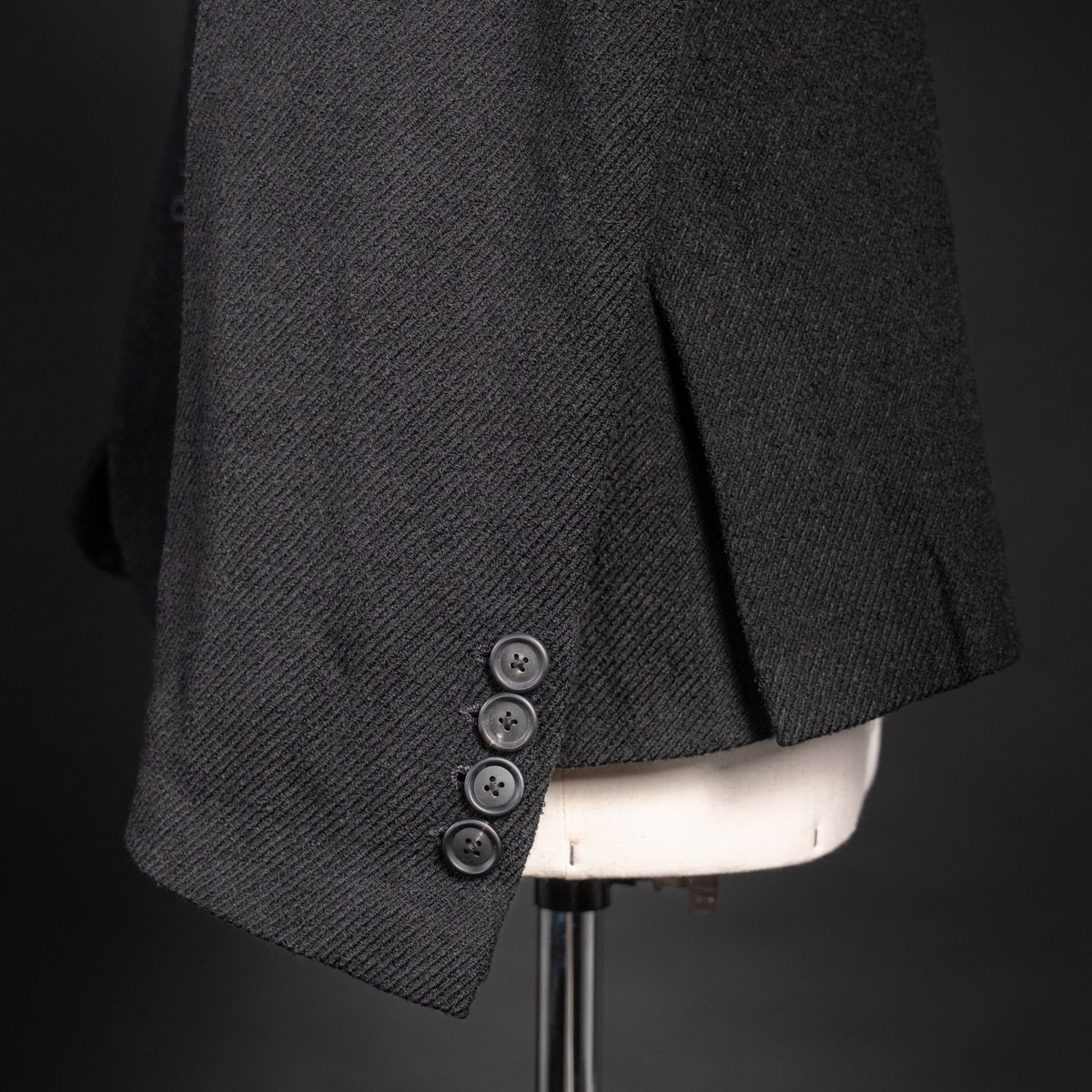 それを用いて仕立てられたのが、今回の4ボタン・シングルブレストのピークドラペルジャケット。