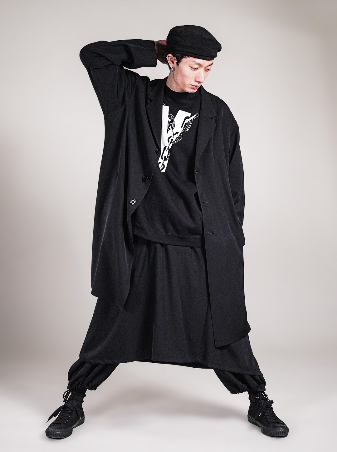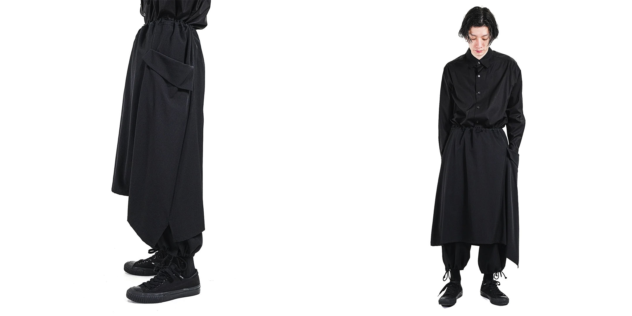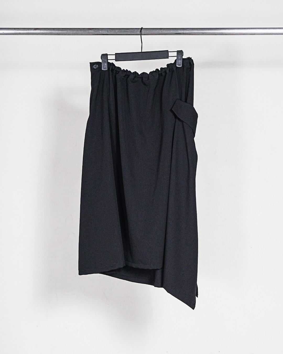ただのラップではなく、左右非対称。 パンツの上に重ねるだけで、 簡単に“ラップパンツ的”見え方に。 バルーンパンツやワイドパンツと合わせると、 一気にヨウジの空気感。