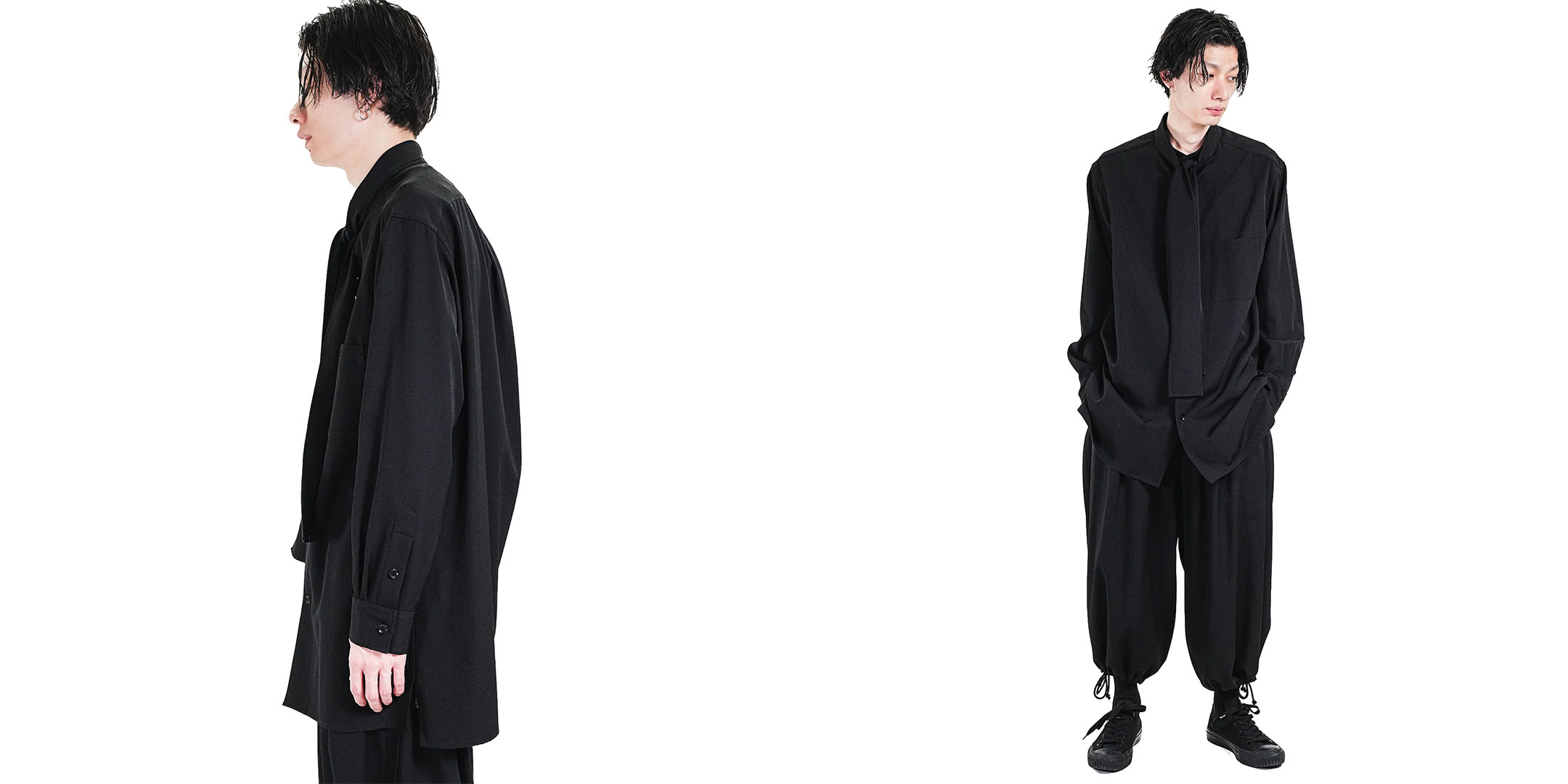 シルエットはドレープが綺麗に落ち、 首元の動きがモードの空気を作ります。