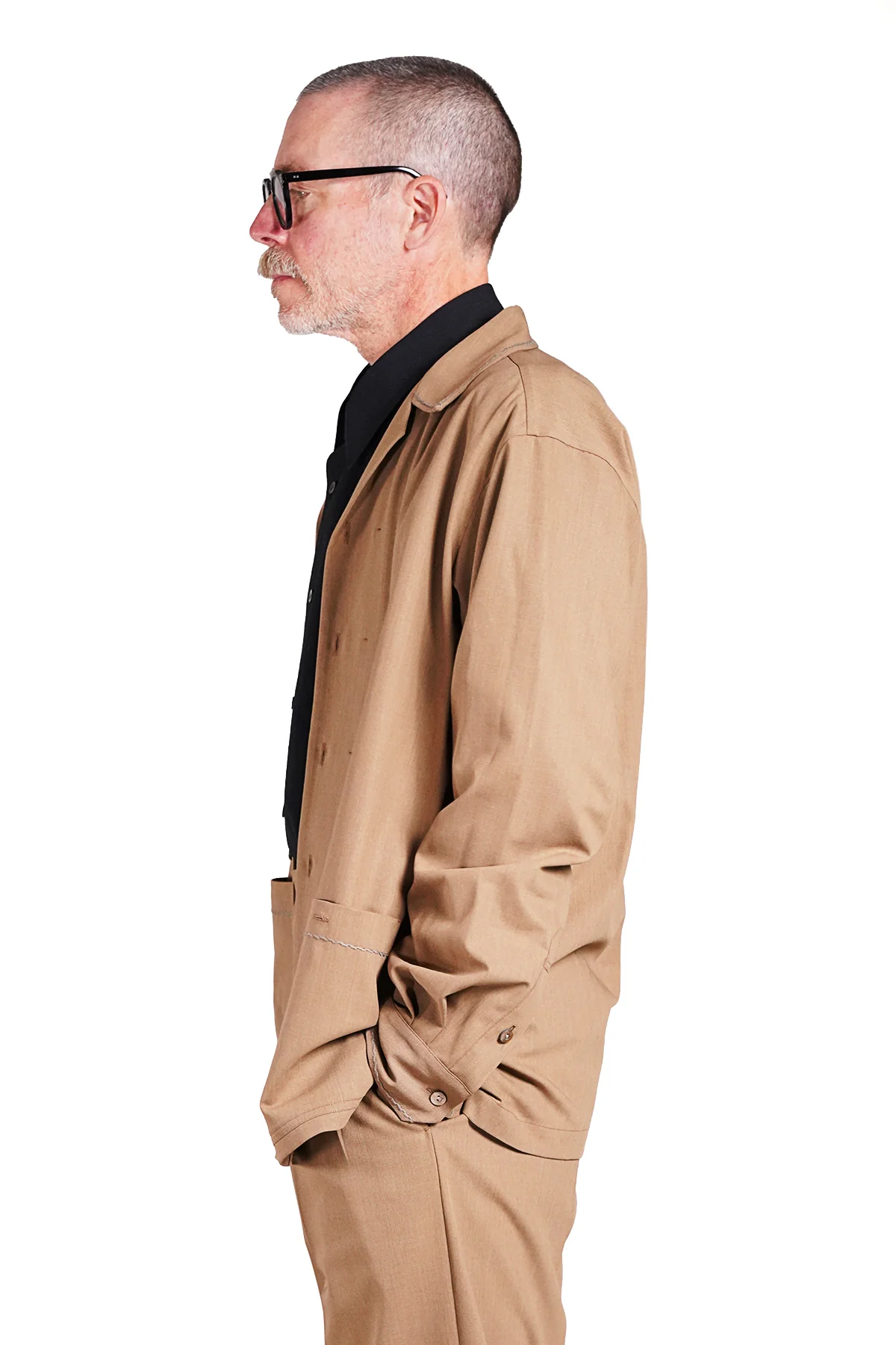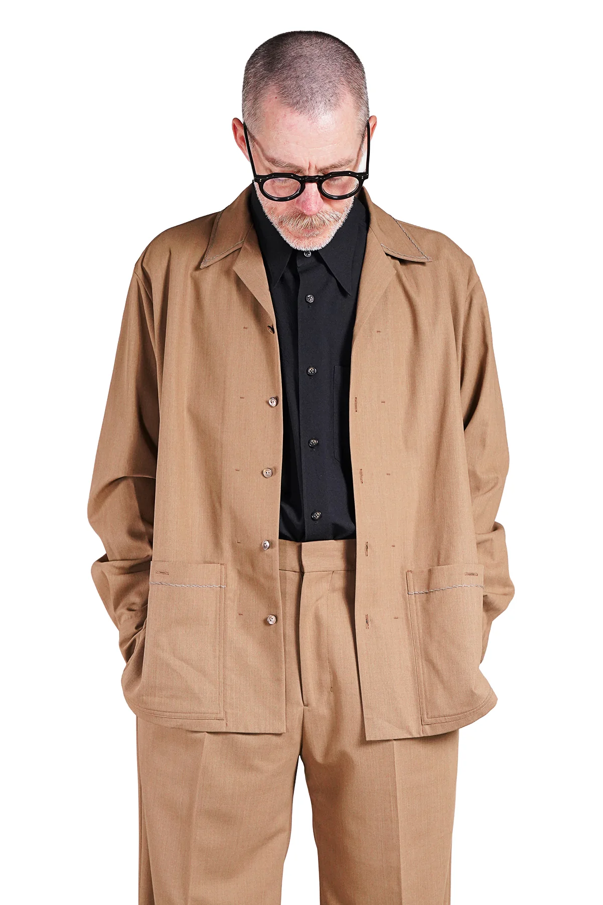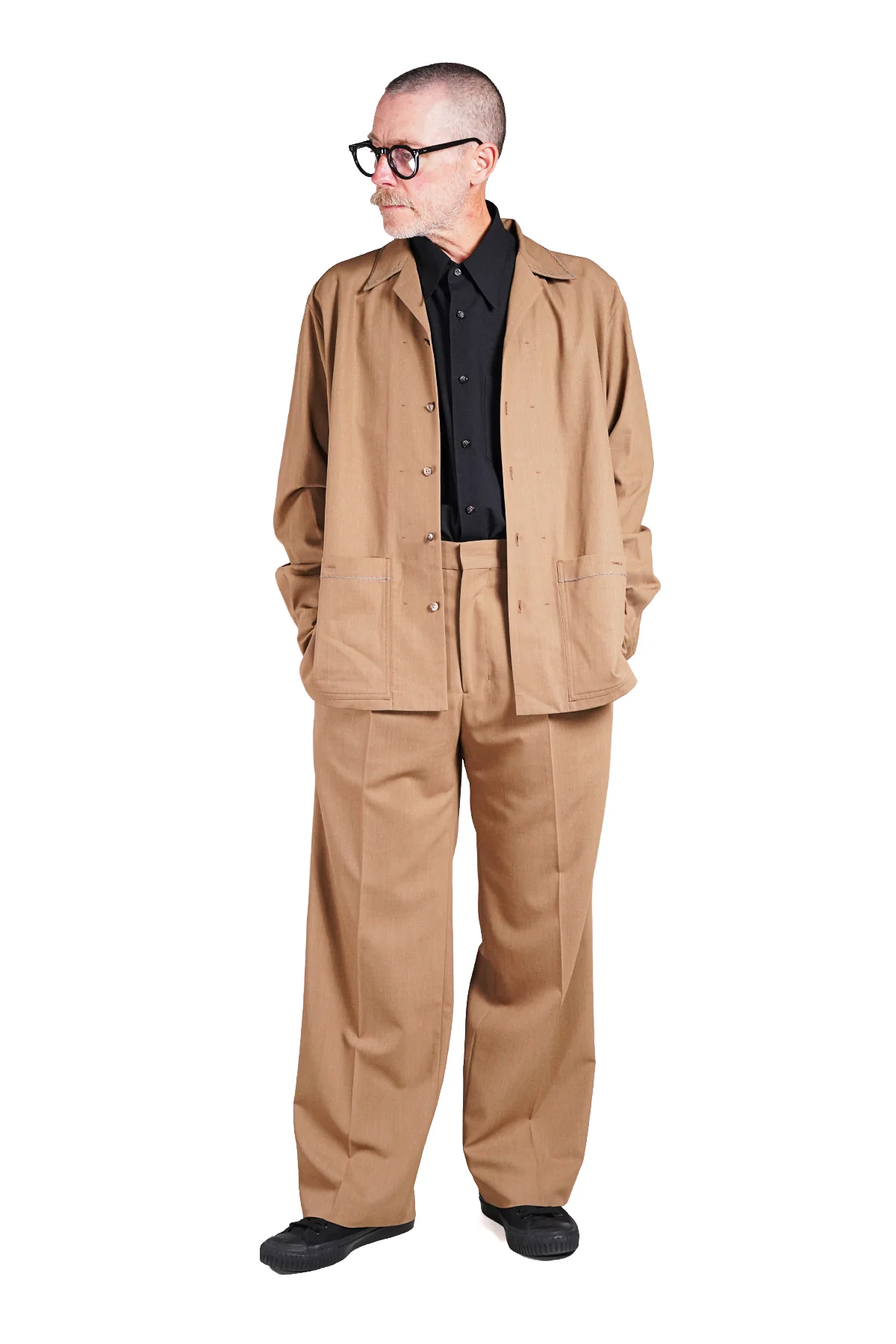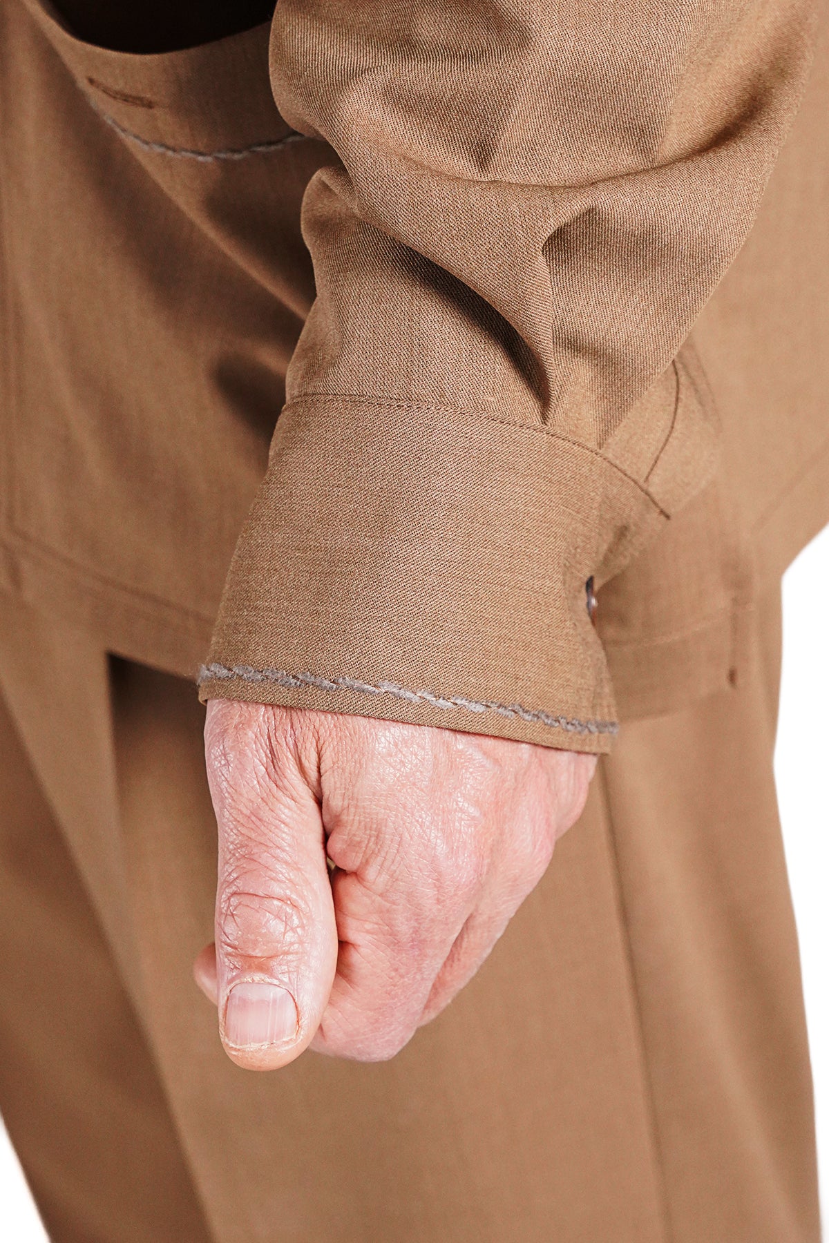 素材は尾州産のウールポリエステル強撚ギャバジン。