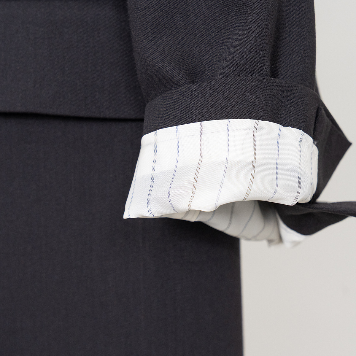 衿裏はカラークロスで仕立て、薄い肩パッドを忍ばせることで自然な立ち上がりをつくり、袖は本切羽仕様。