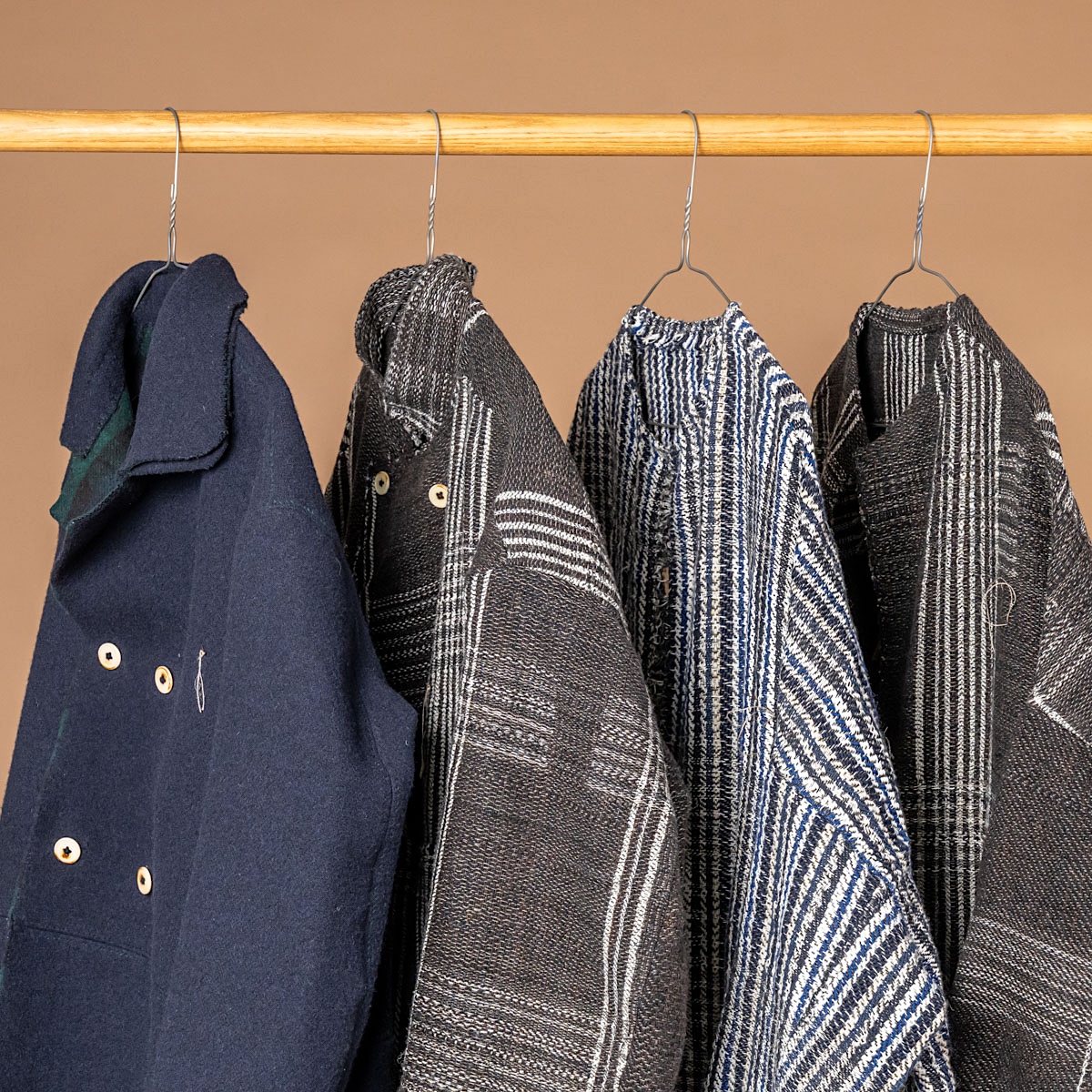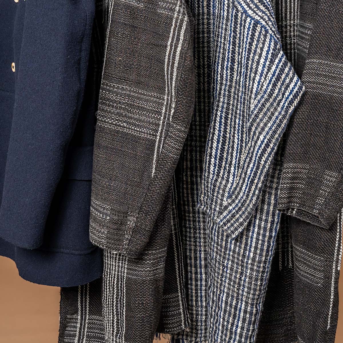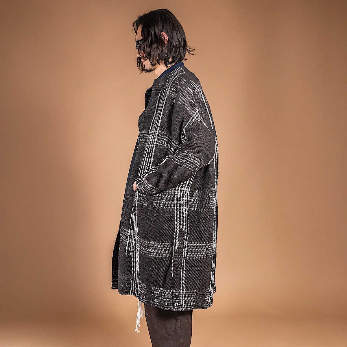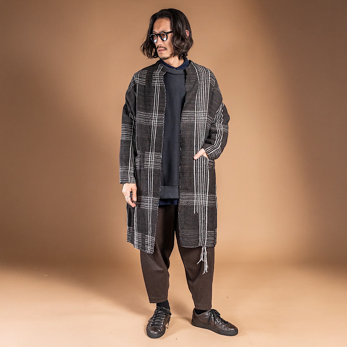動くたびに裾や見返しからチェックがわずかにのぞき、ネイビーの端正さに温度と奥行きを与える。