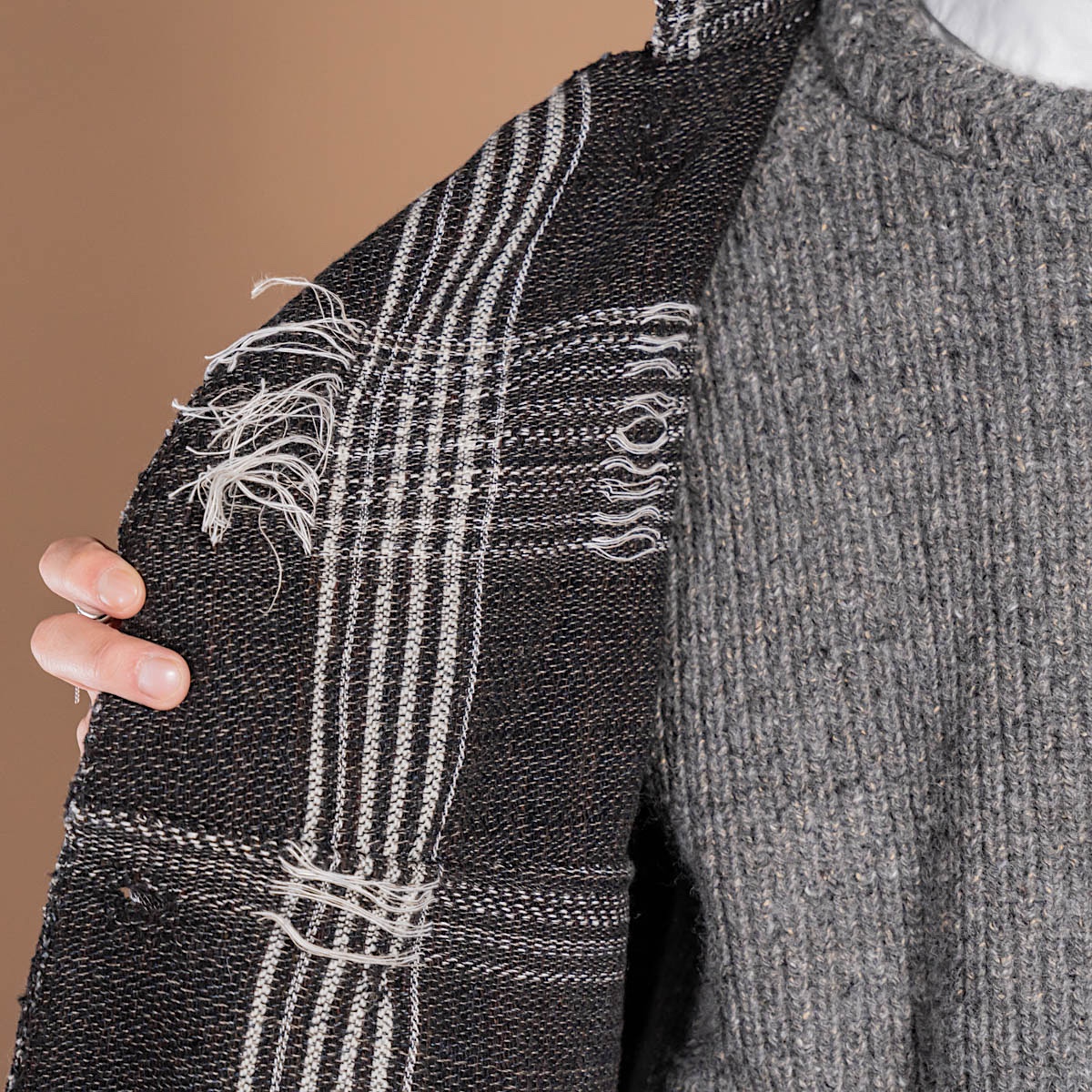 さらに、鮮やかな色糸や異なる質感の糸を撚り合わせることで、生地の凹凸が生まれ、陰影と色味が相互作用して独特の表情を持つ仕上がりになっています。