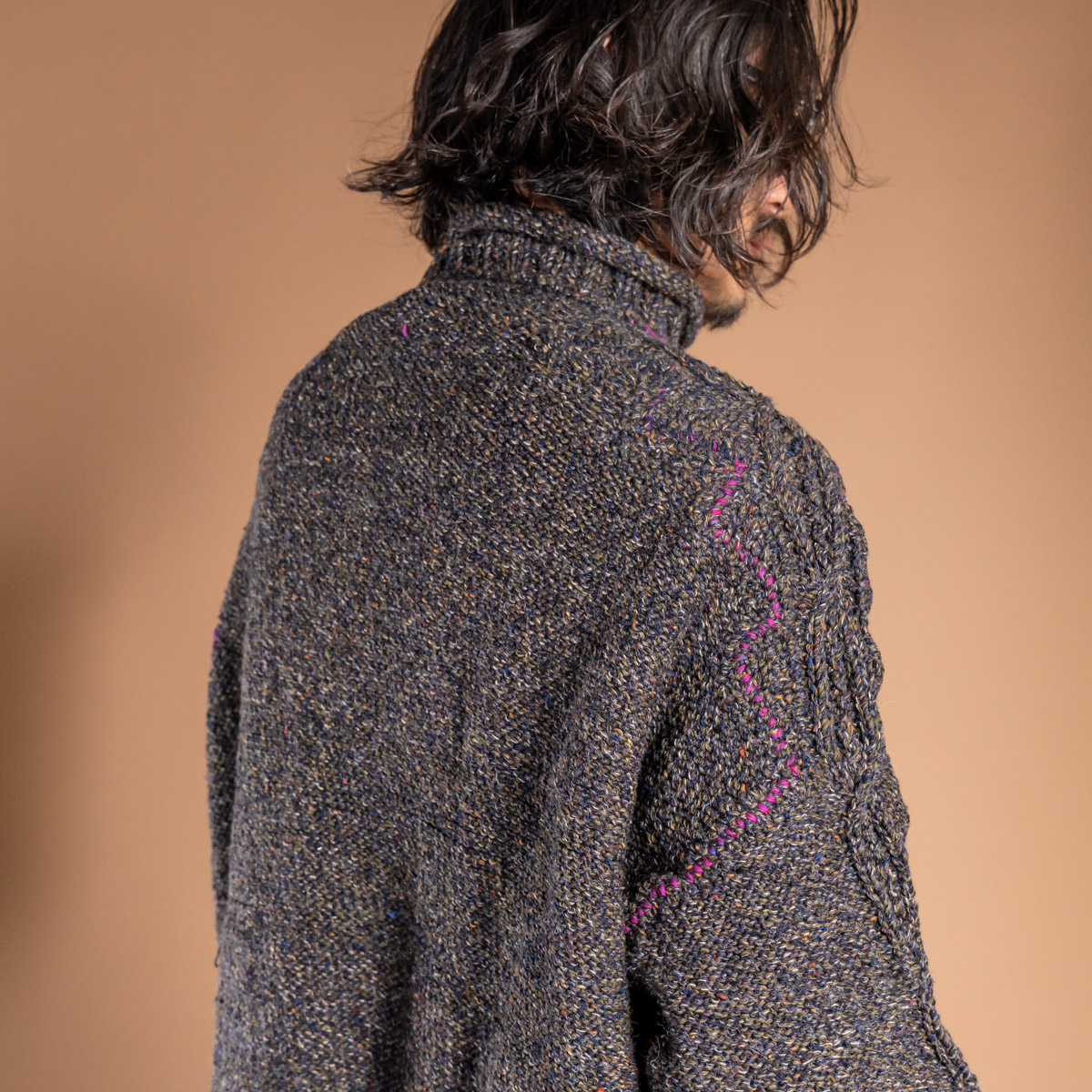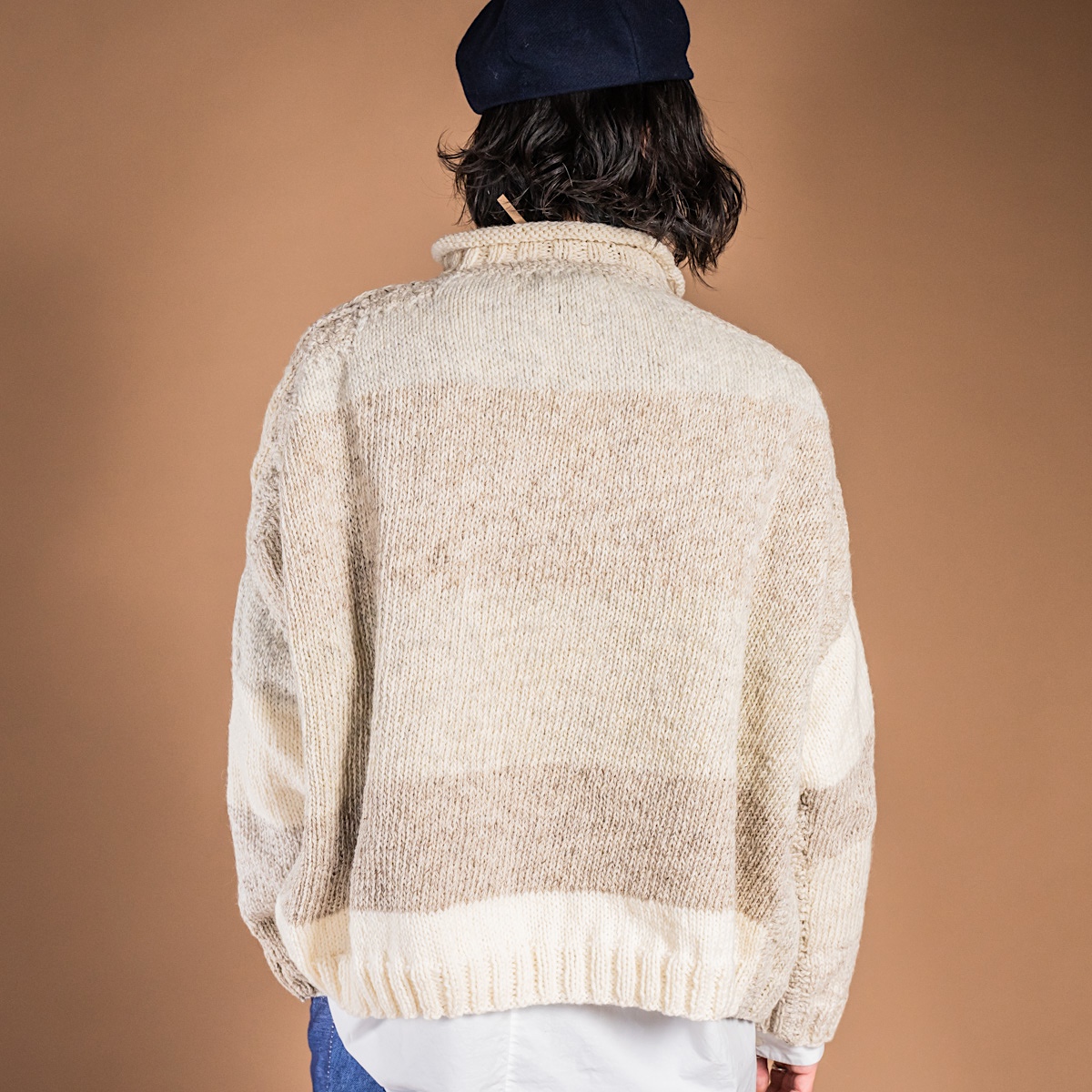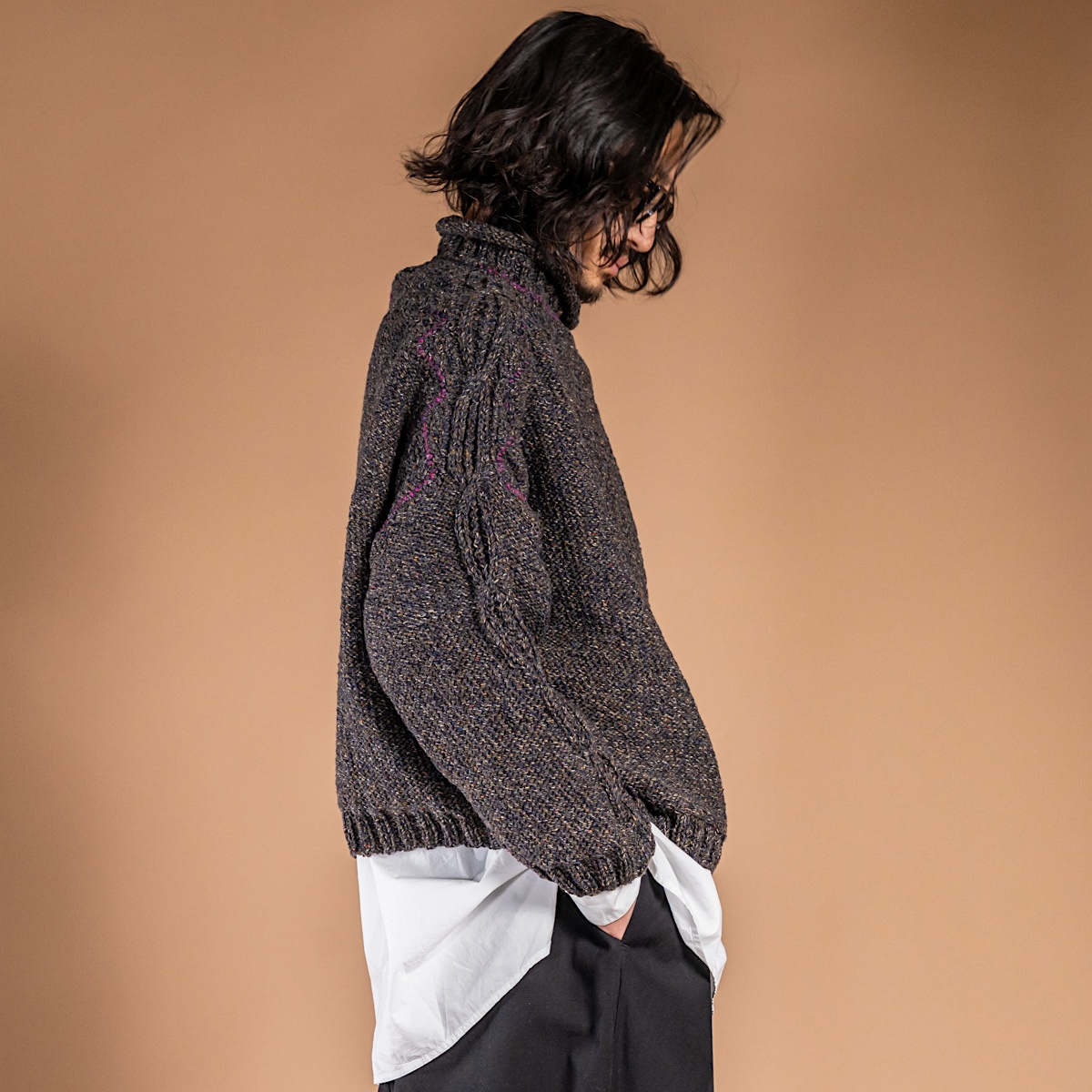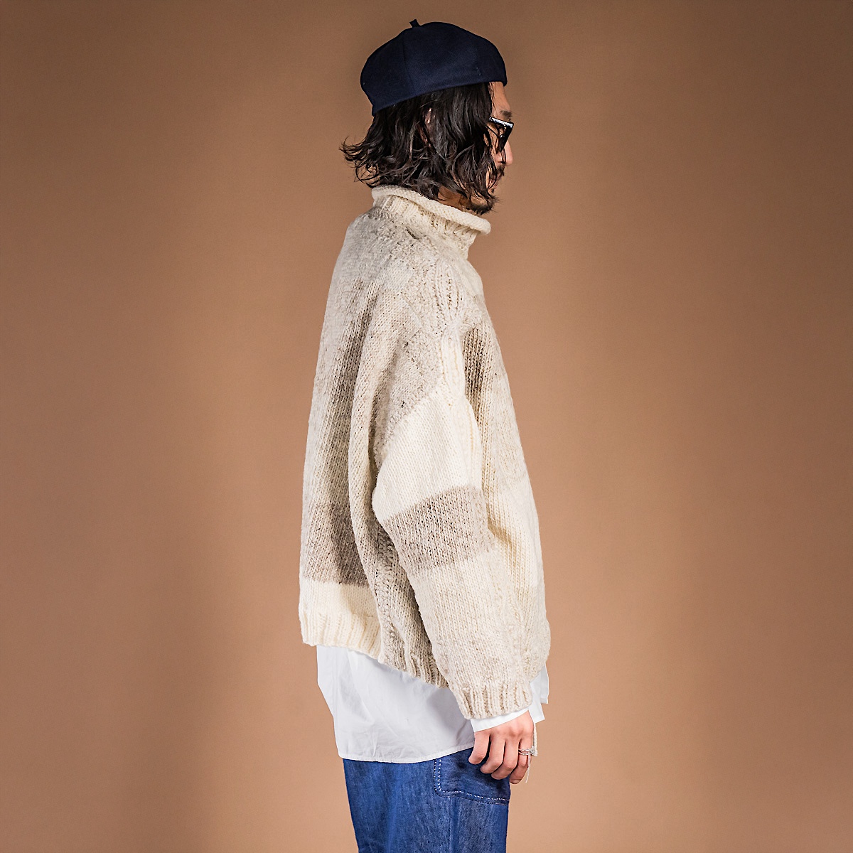 普段愛用している厚手のアランニットの特徴を取り入れ、独自の編み地デザインを完成させたニット。