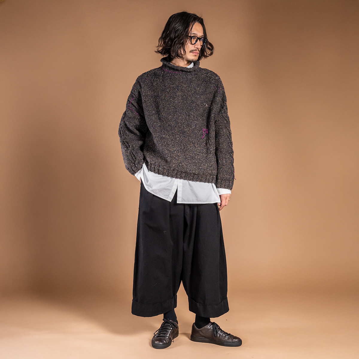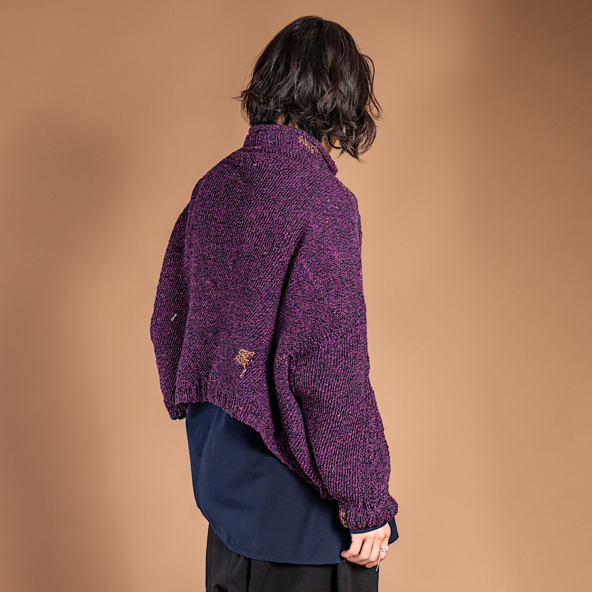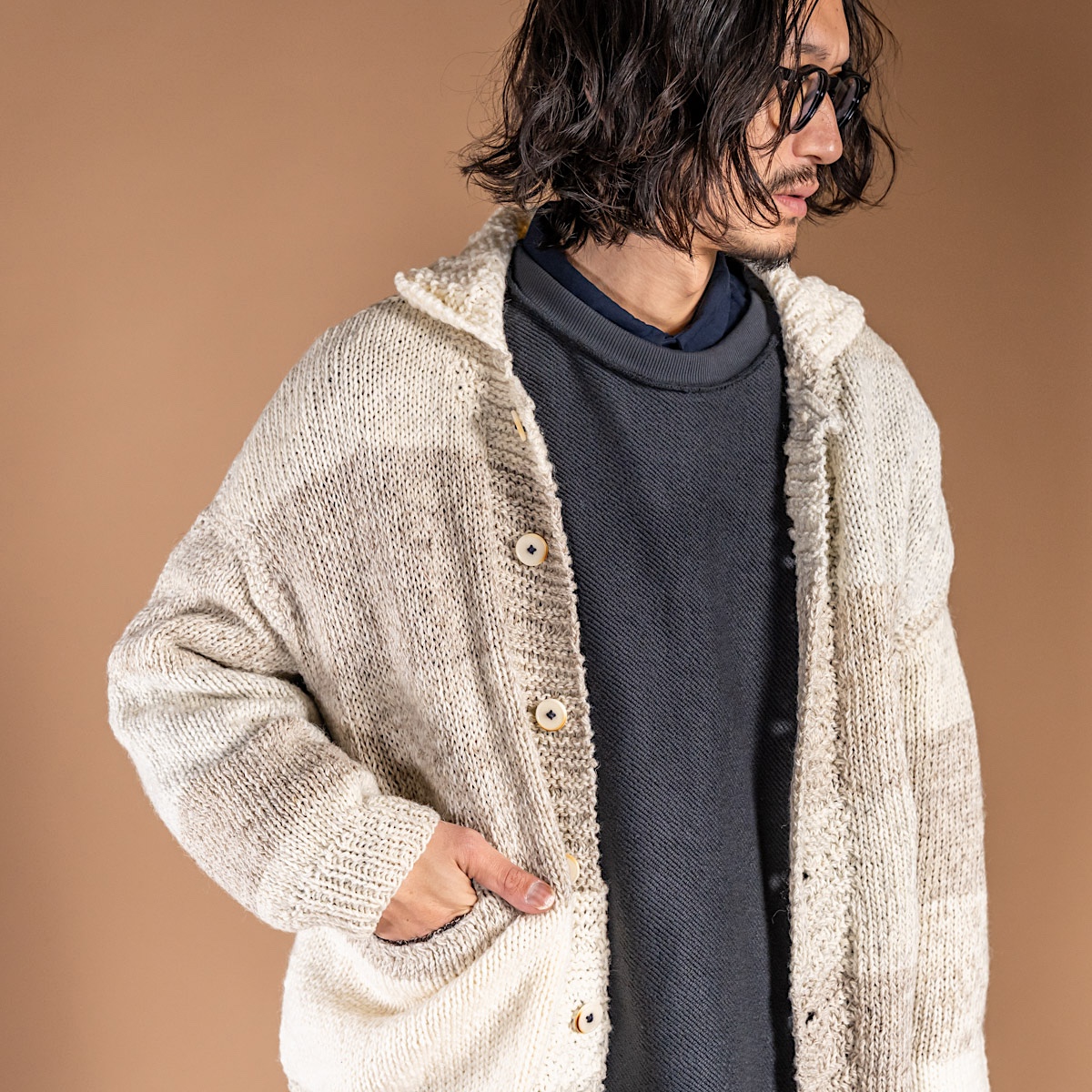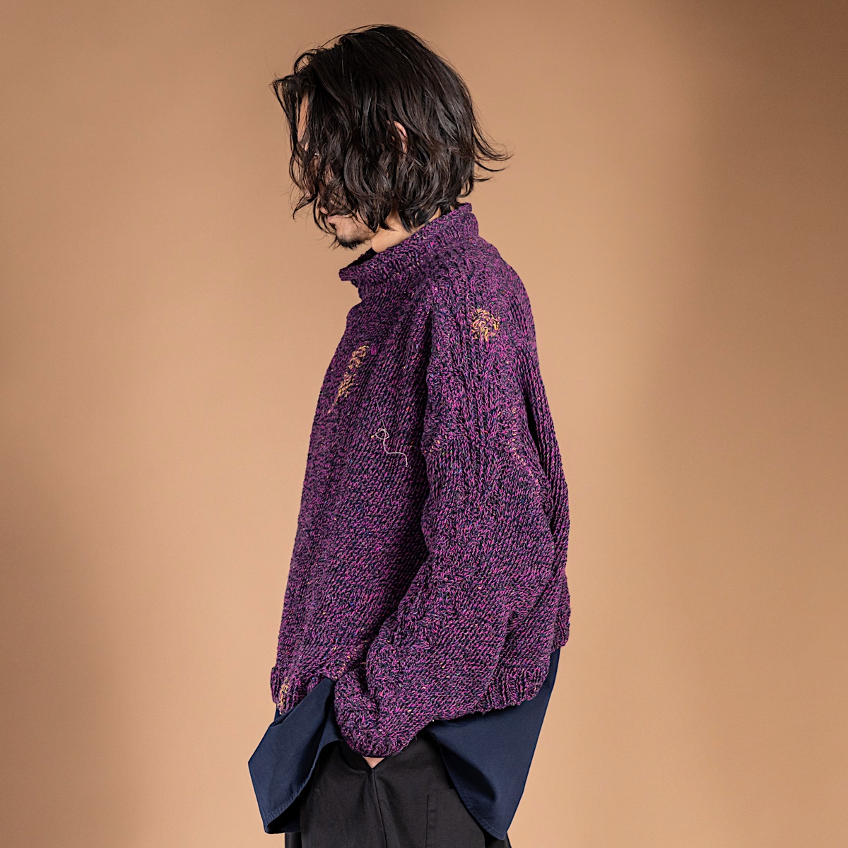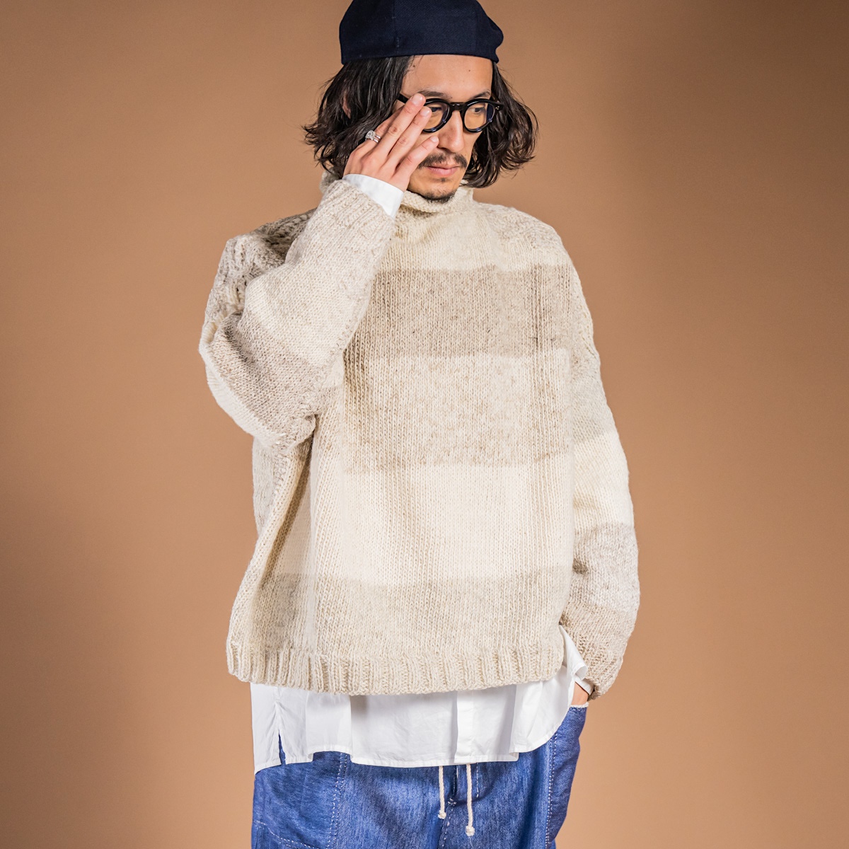 普段愛用している厚手のアランニットの特徴を取り入れ、独自の編み地デザインを完成させたニット。