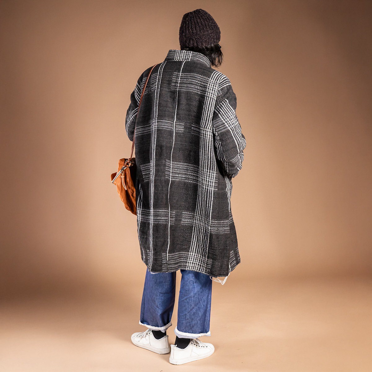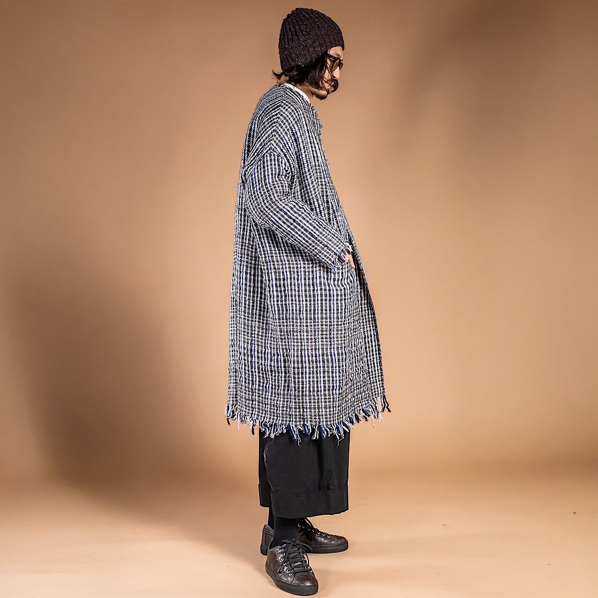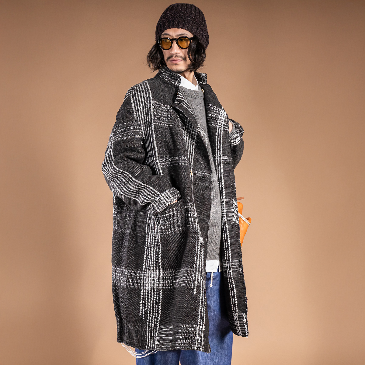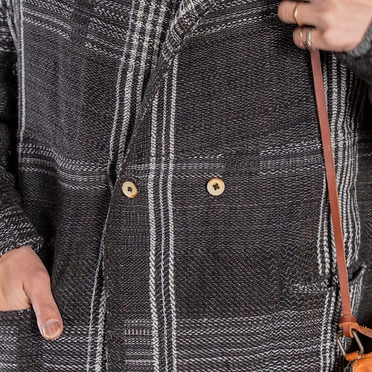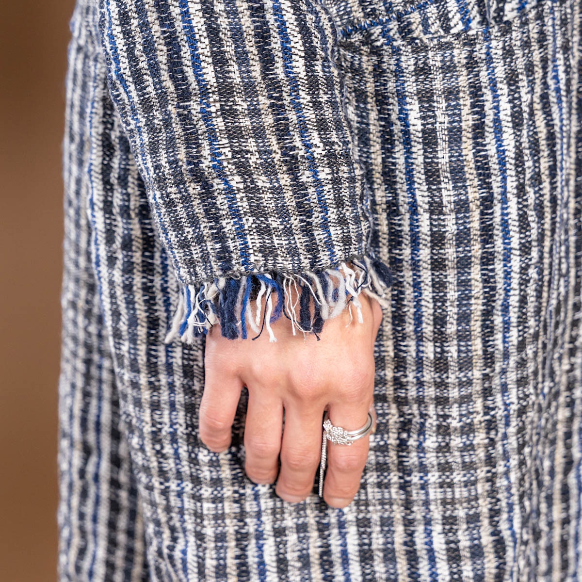 アメリカから取り寄せた特別な手機織機を活用し、自身のアトリエで制作されたこの生地は、まさに彼女のクリエイティビティが詰まった逸品です。
