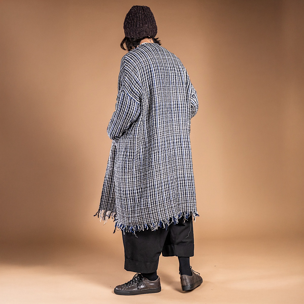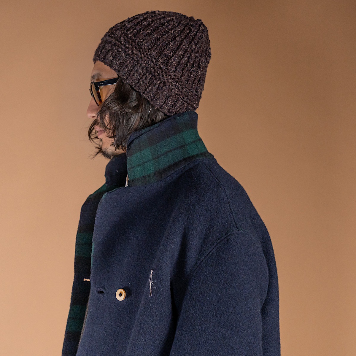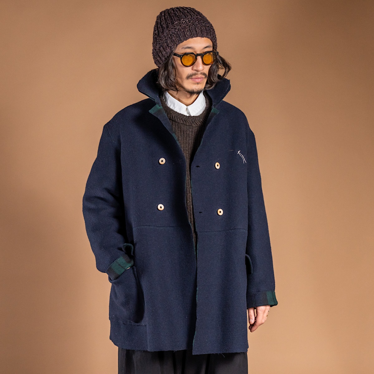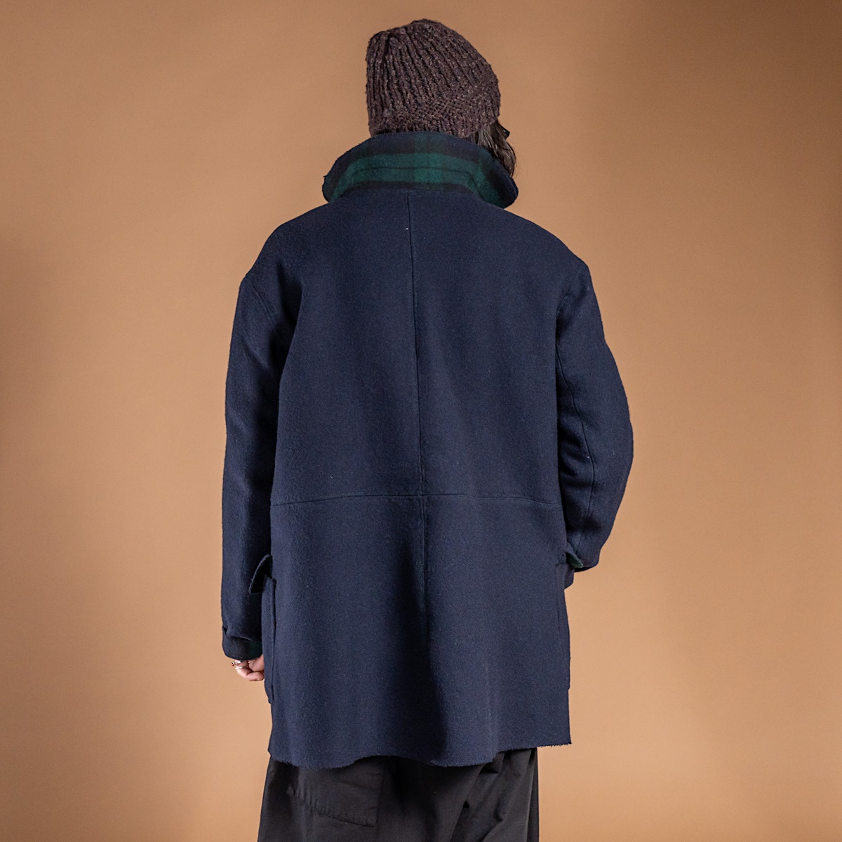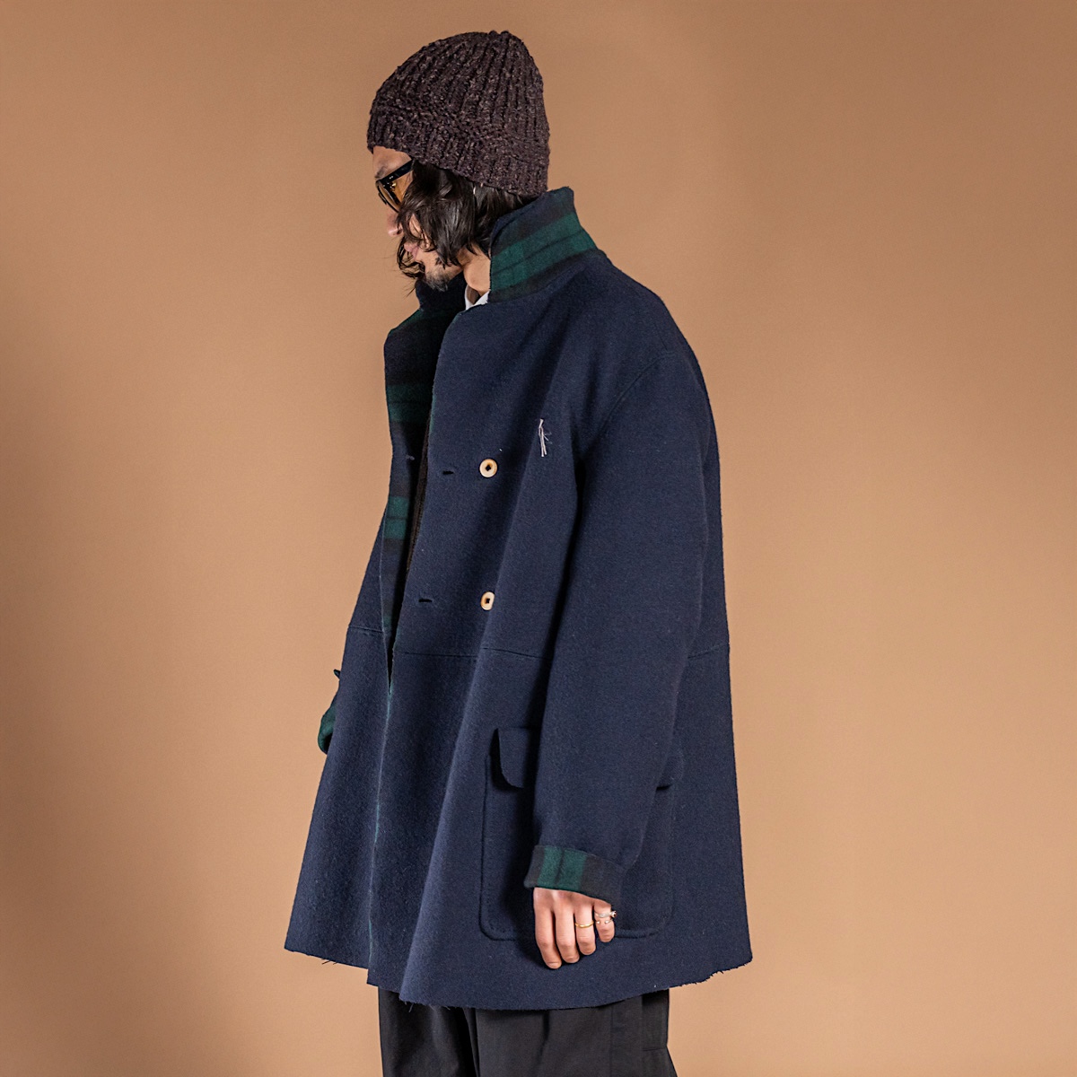 表はフランネル調のネイビー、裏はクラシックなチェック——二つの表情を併せ持つダブルフェイス。