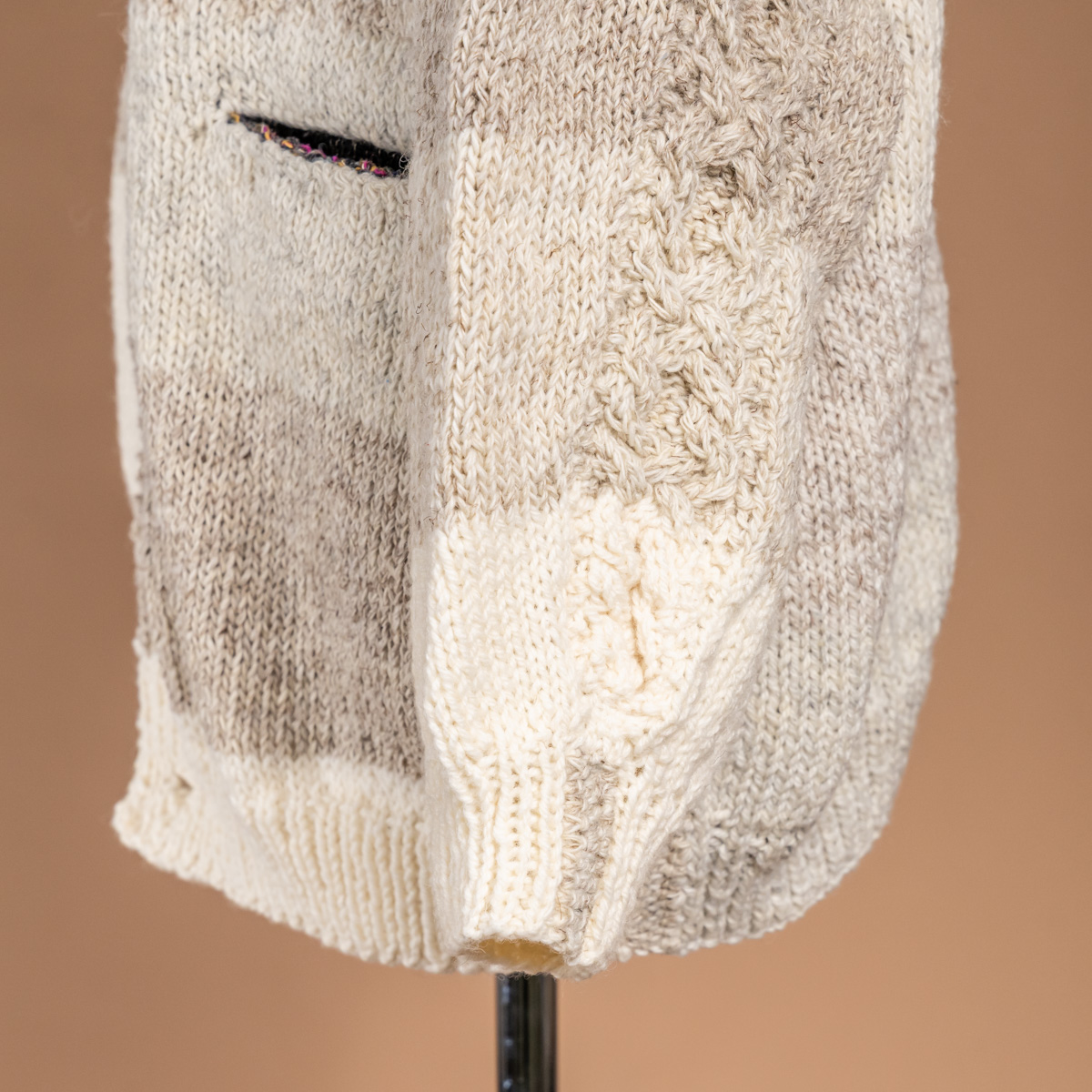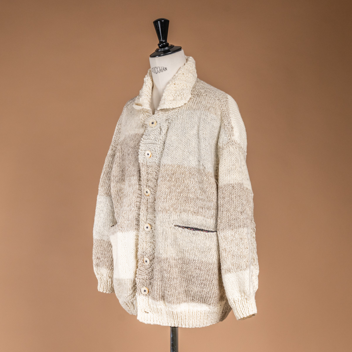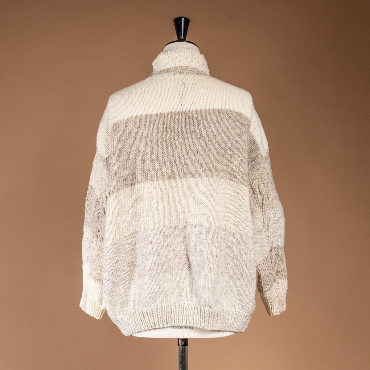アイボリーからベージュへと移ろう、微妙に異なる4色の毛糸を使い、ストライプ状に手編みされています。