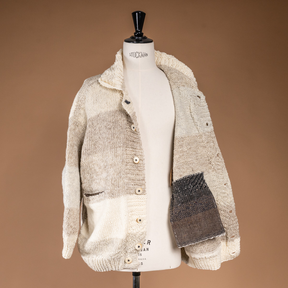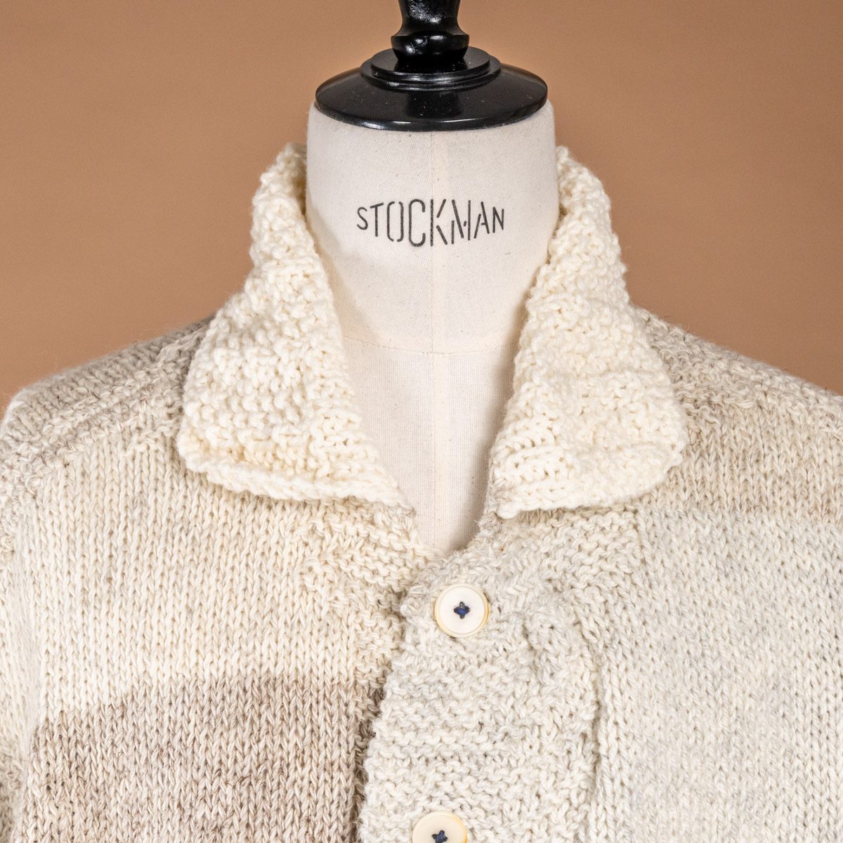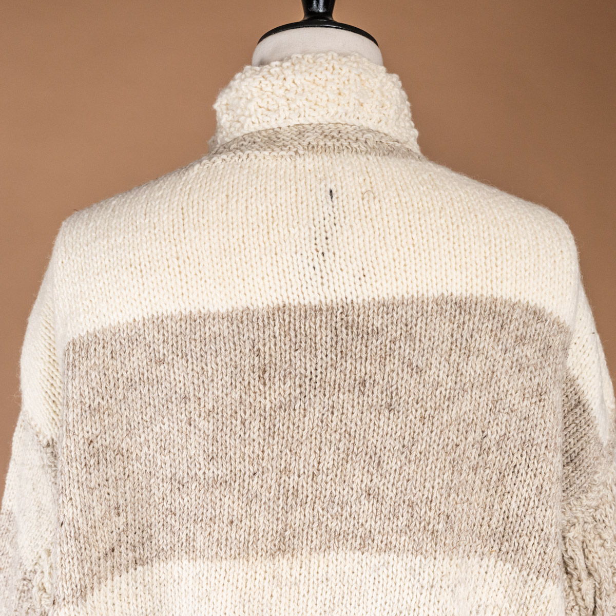 アイボリーからベージュへと移ろう、微妙に異なる4色の毛糸を使い、ストライプ状に手編みされています。
