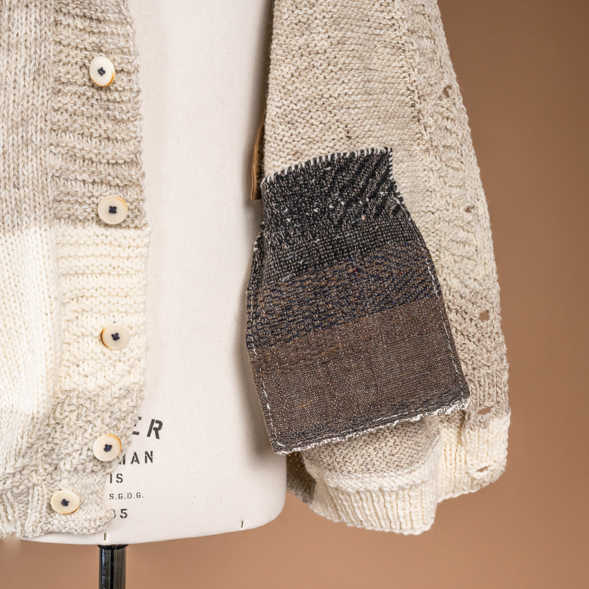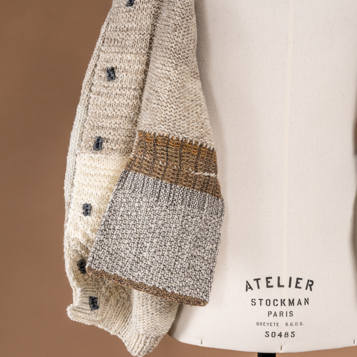 自身の機織り生地のデザインからパターンを抜き出し、ニットとして再構築することで、 どこか新しく、それでいて親しみのある編み柄が生まれています。