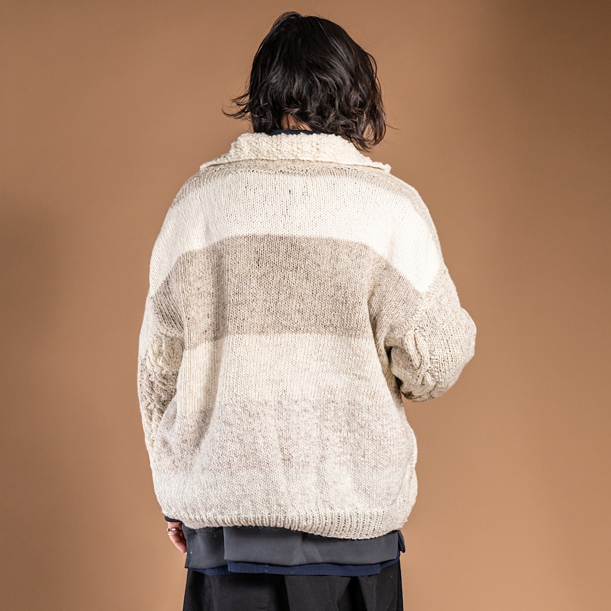 大量生産では決して生まれない、手編みならではの風合いと時間をまとったニット。