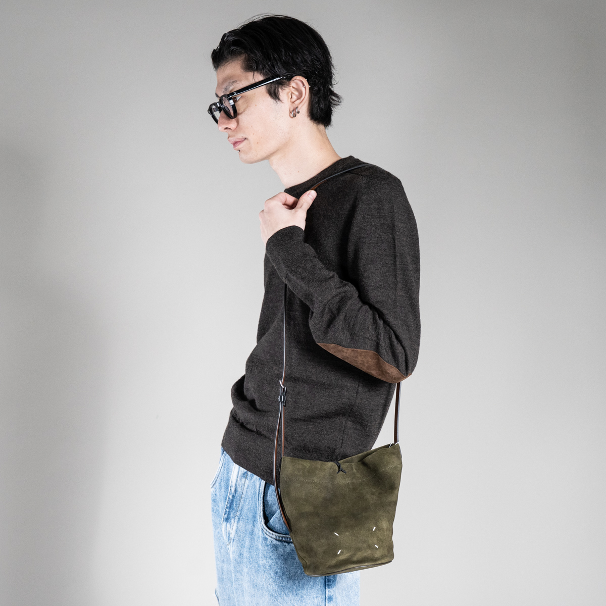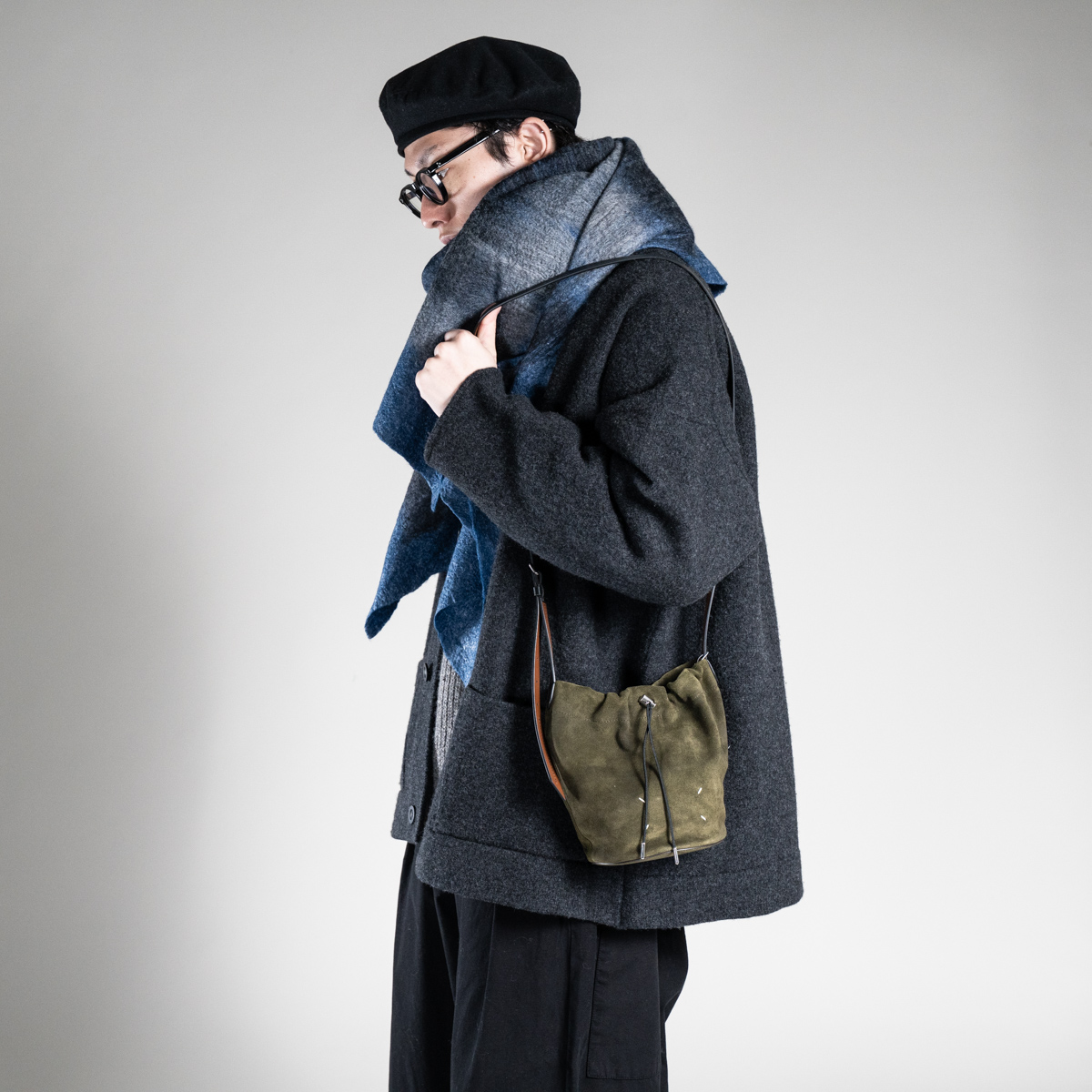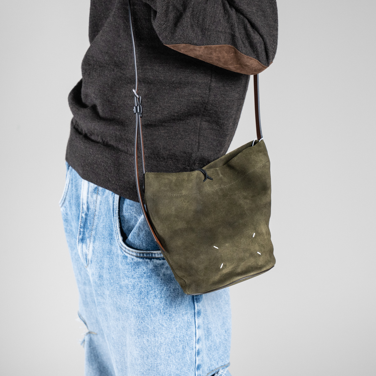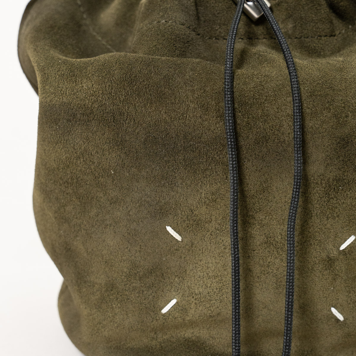 カーキのカーフスエードで構成されたバケット型は、口元をキュッと絞るドローストリングとマグネットの併用で開閉もスムーズ。