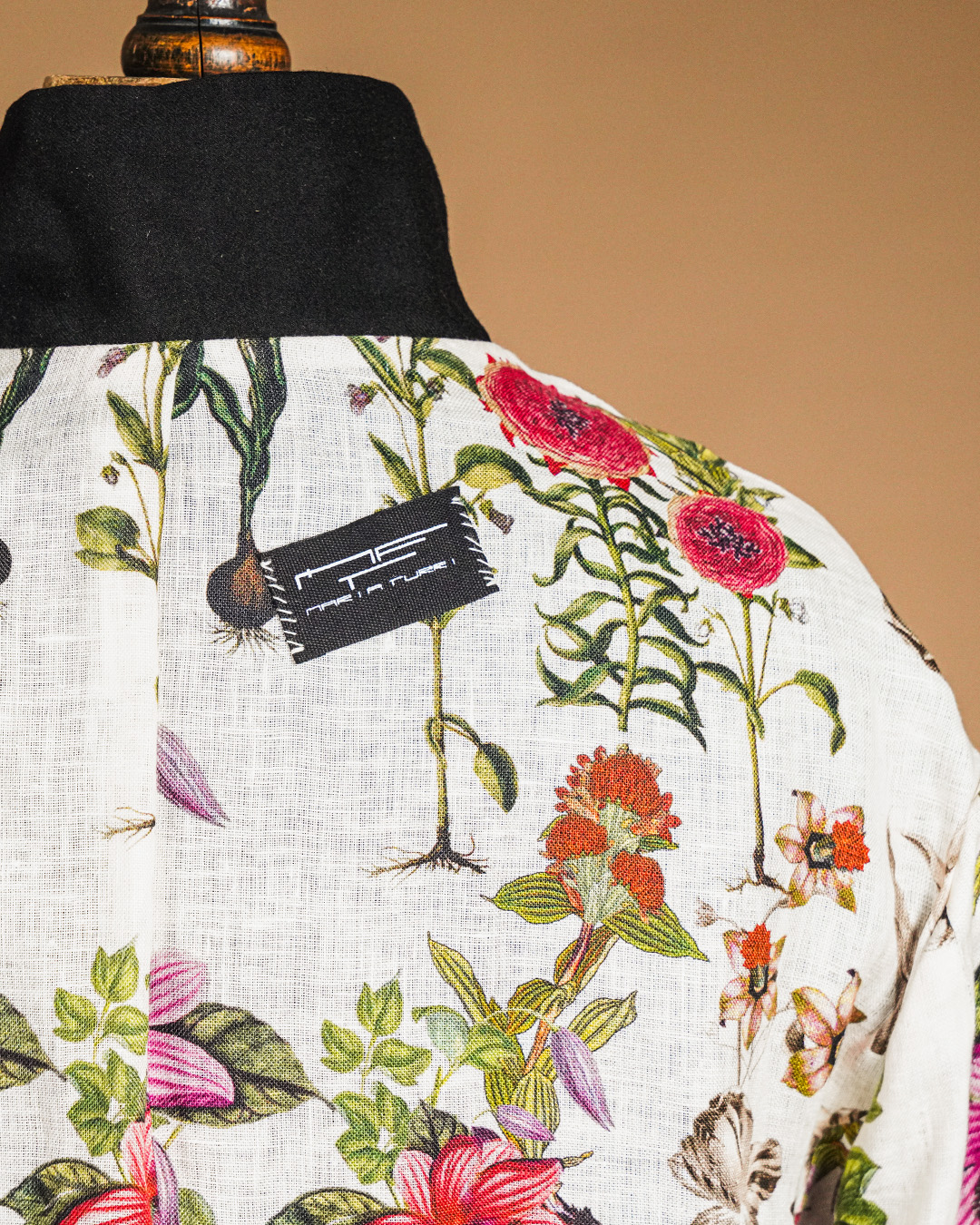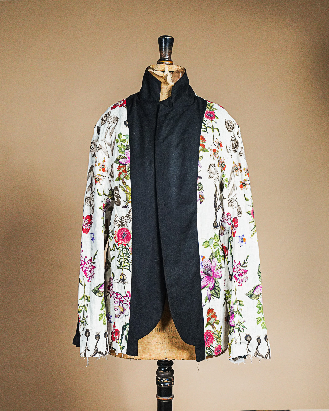 今回は2型をご用意していますが、ここでは着物ジャケットと同様のボタニカル柄を裏地に用いた総柄仕様をご紹介します。