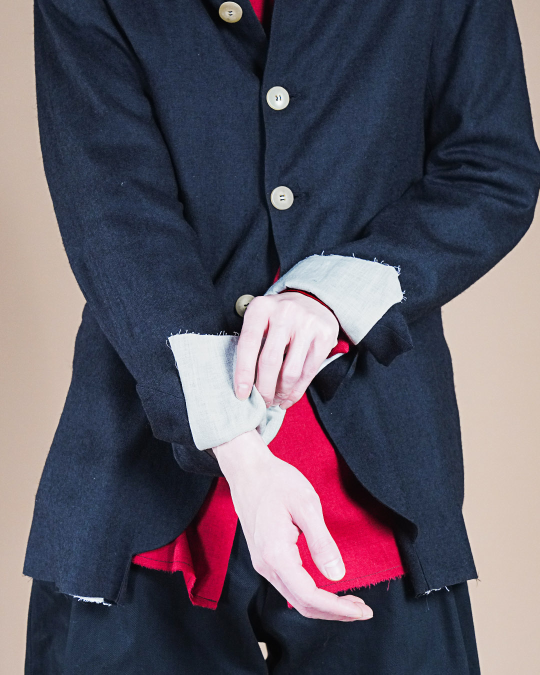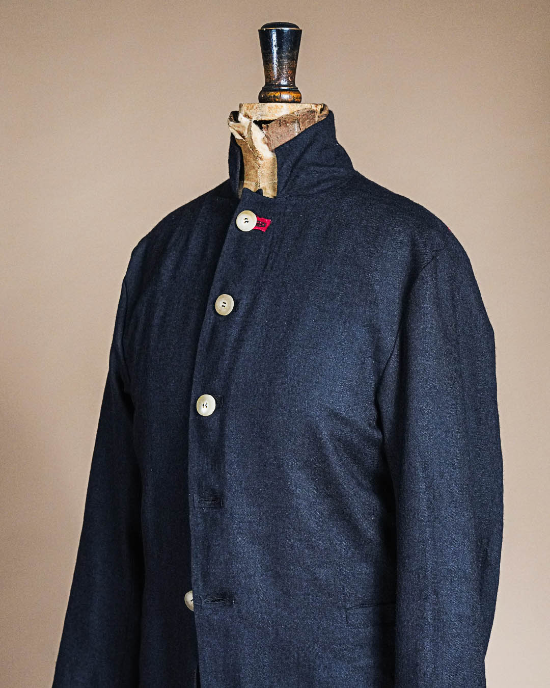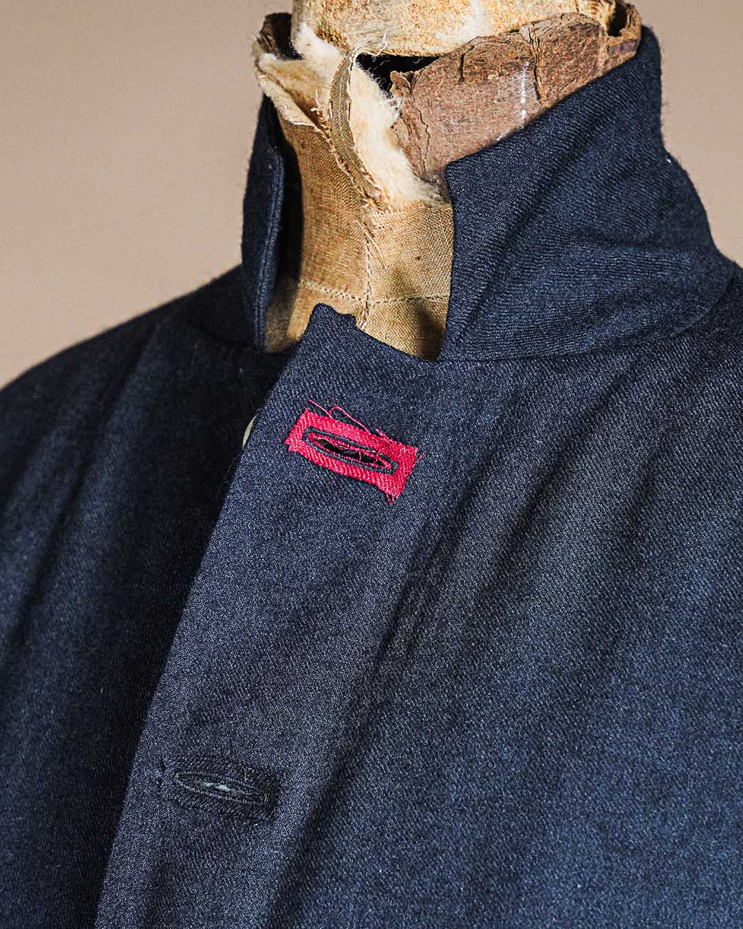 すべてハンドメイドで施されたボタンホールは、遠目にはさりげなく、近くで見ると一針ごとの表情がはっきりと伝わります。