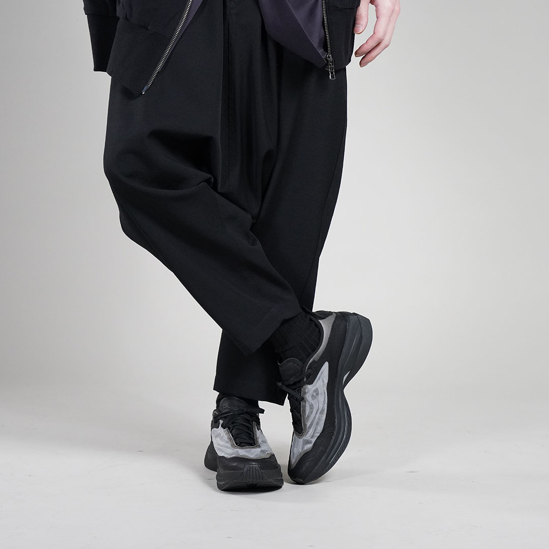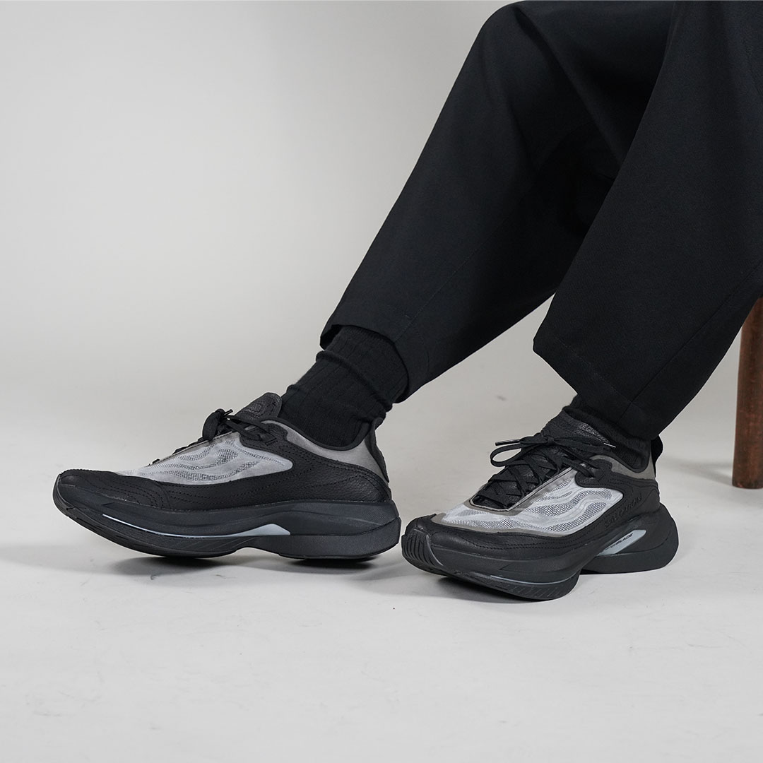 カラーはオールブラックで統一されていながら、素材ごとの表情の違いや、ミッドソールから覗くシルバーのパーツが、さりげなく近未来的なニュアンスを添えています。