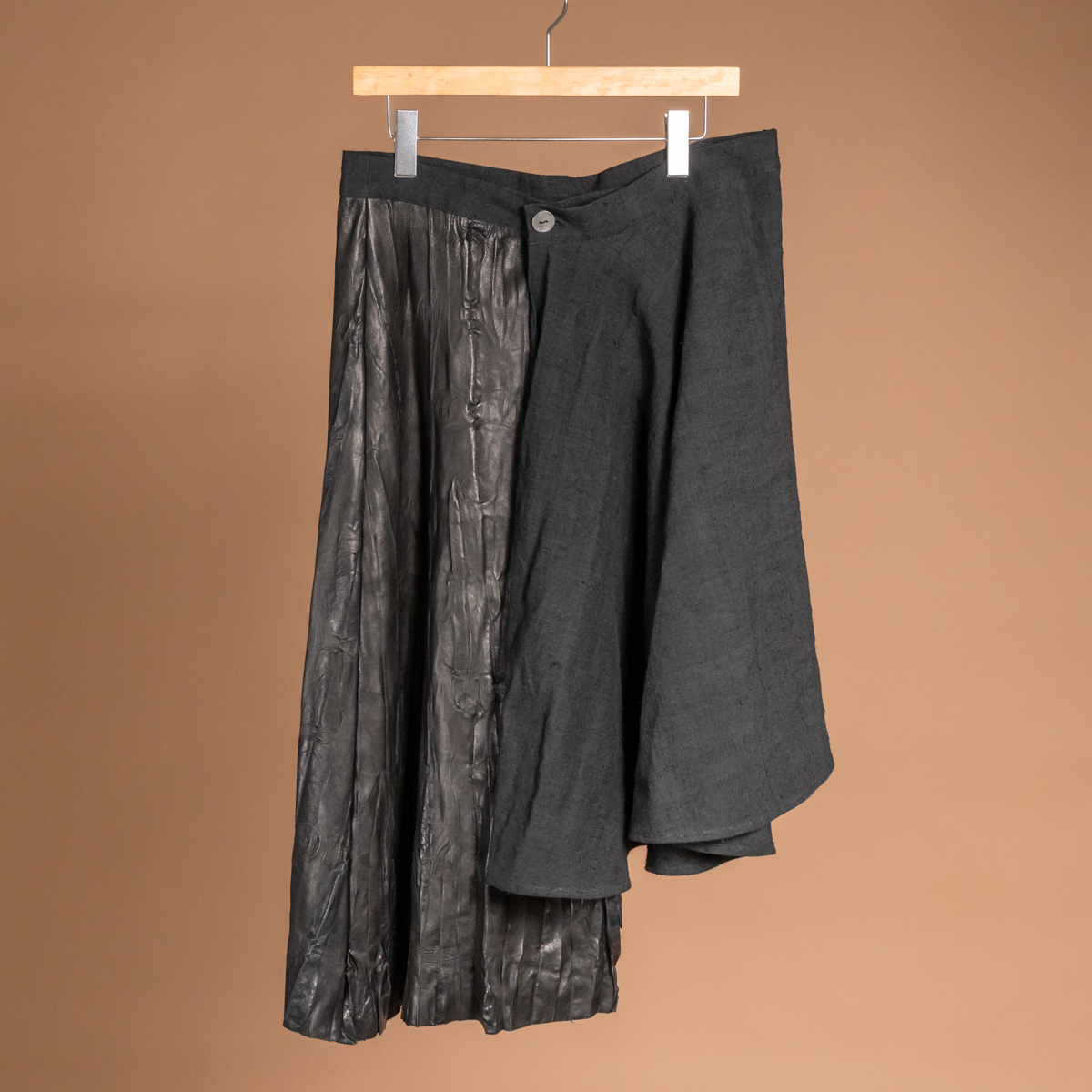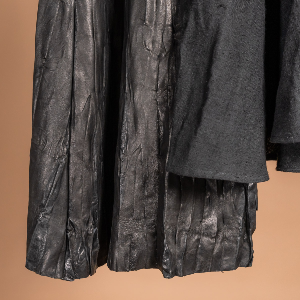 ヘンプとラムレザーの素材感、アシンメトリーの構築、切りっぱなしの表現。