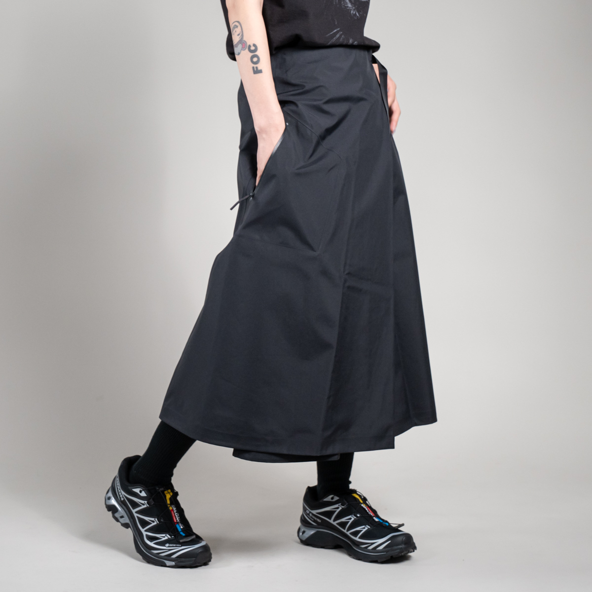 パンツの上から巻いて着用することで、モードなレイヤードスタイルを楽しむことができます。