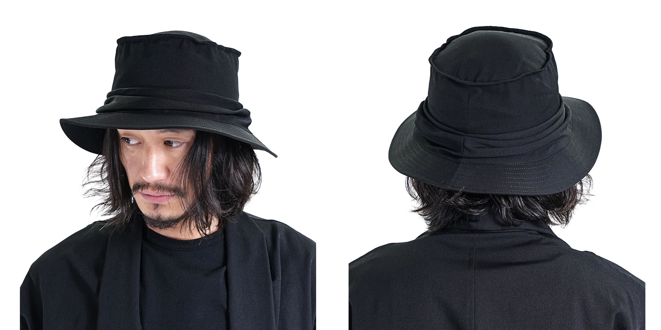 仕上げに欠かせないのが、浅めのフォルムと生地が重なり合うドレープが美しい「ギャバハット」です。