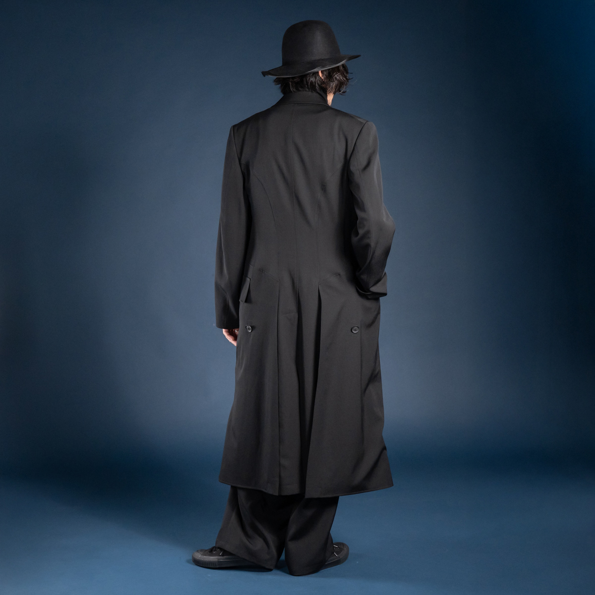 ヨウジヤマモトのアウターはボックス型でゆったりしたシルエットが多い中、このナポレオンロングジャケットはウエストを軽くシェイプさせています。