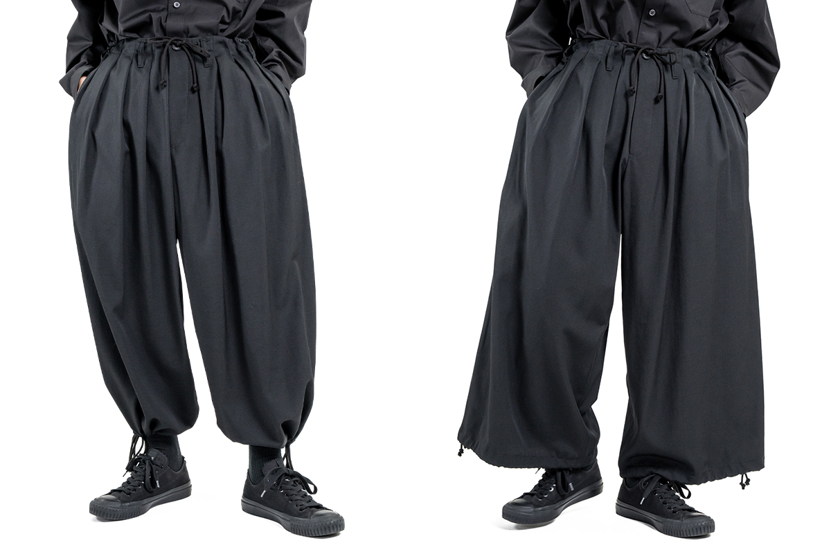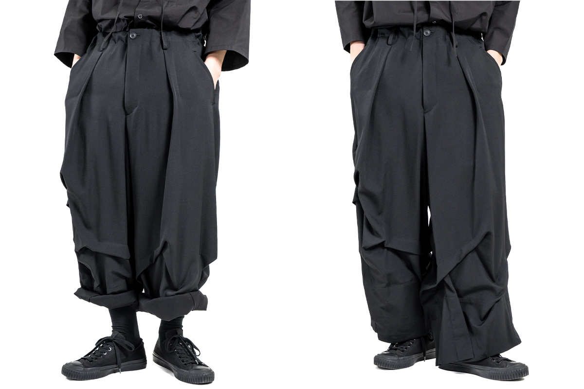 裾を絞ると生まれる楕円形の立体シルエットが特徴で、どの角度から見ても美しいドレープが出る名作パンツ。