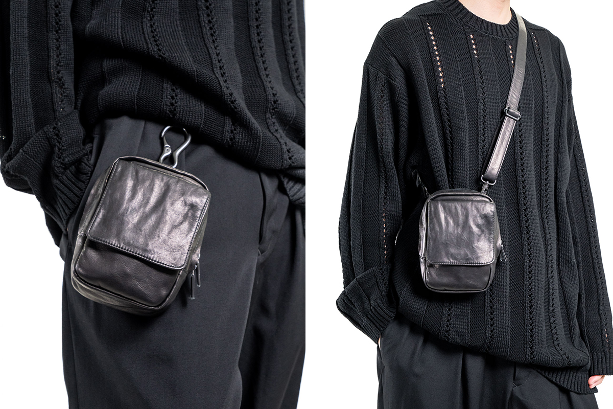 滑らかな光沢を持つレザーを用いた小型ポーチで、ショルダーでもカラビナでも使用できる汎用性の高さが魅力。