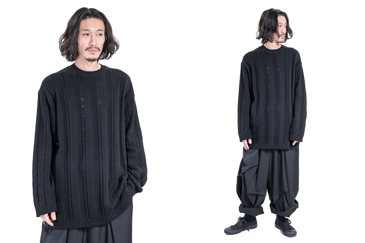 全体に細かな透かし編みが入っており、ブラックでも軽やかな印象を作れるコットンニット。