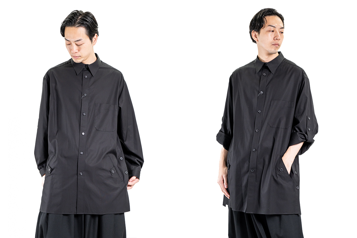 各所に配置されたボタンやタブにより、スリット調整やロールアップなど多彩なアレンジが可能なシャツ。
