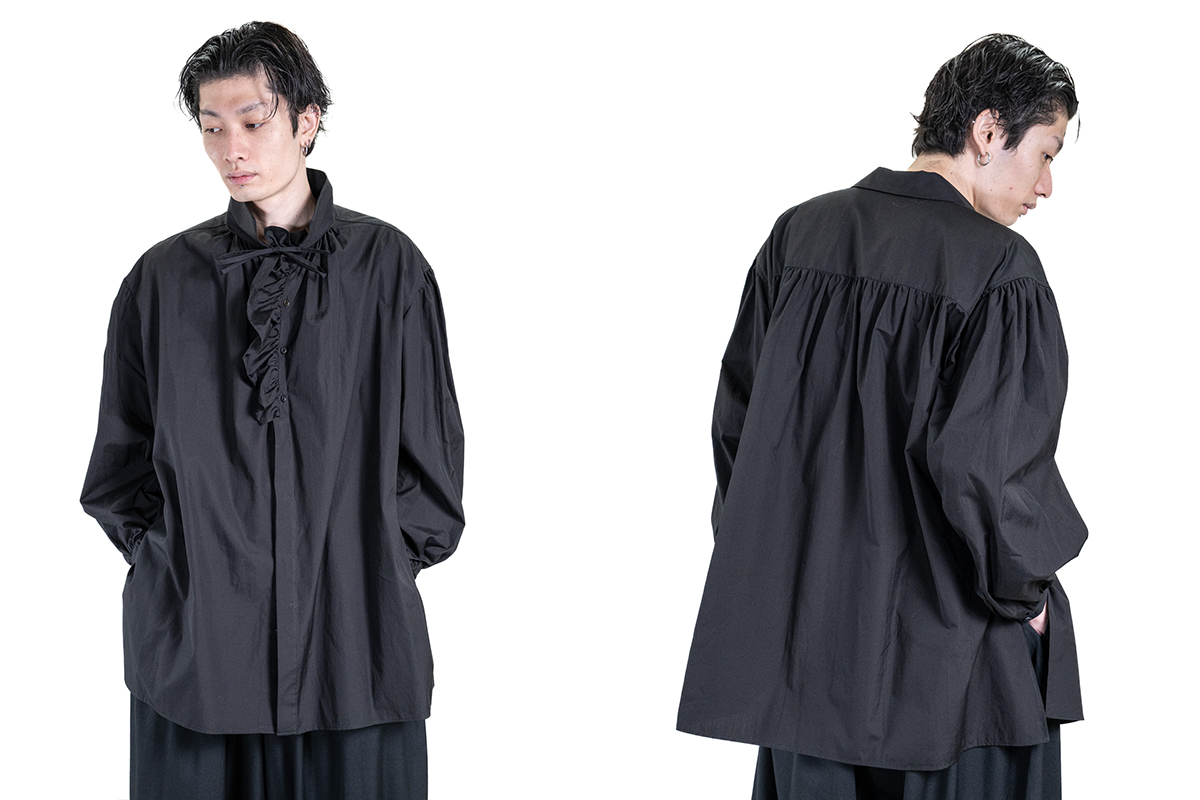 たっぷりと取られた肩幅と身幅、そしてフロントのフリルによってアンニュイな雰囲気とモードな雰囲気が同居するシャツに。